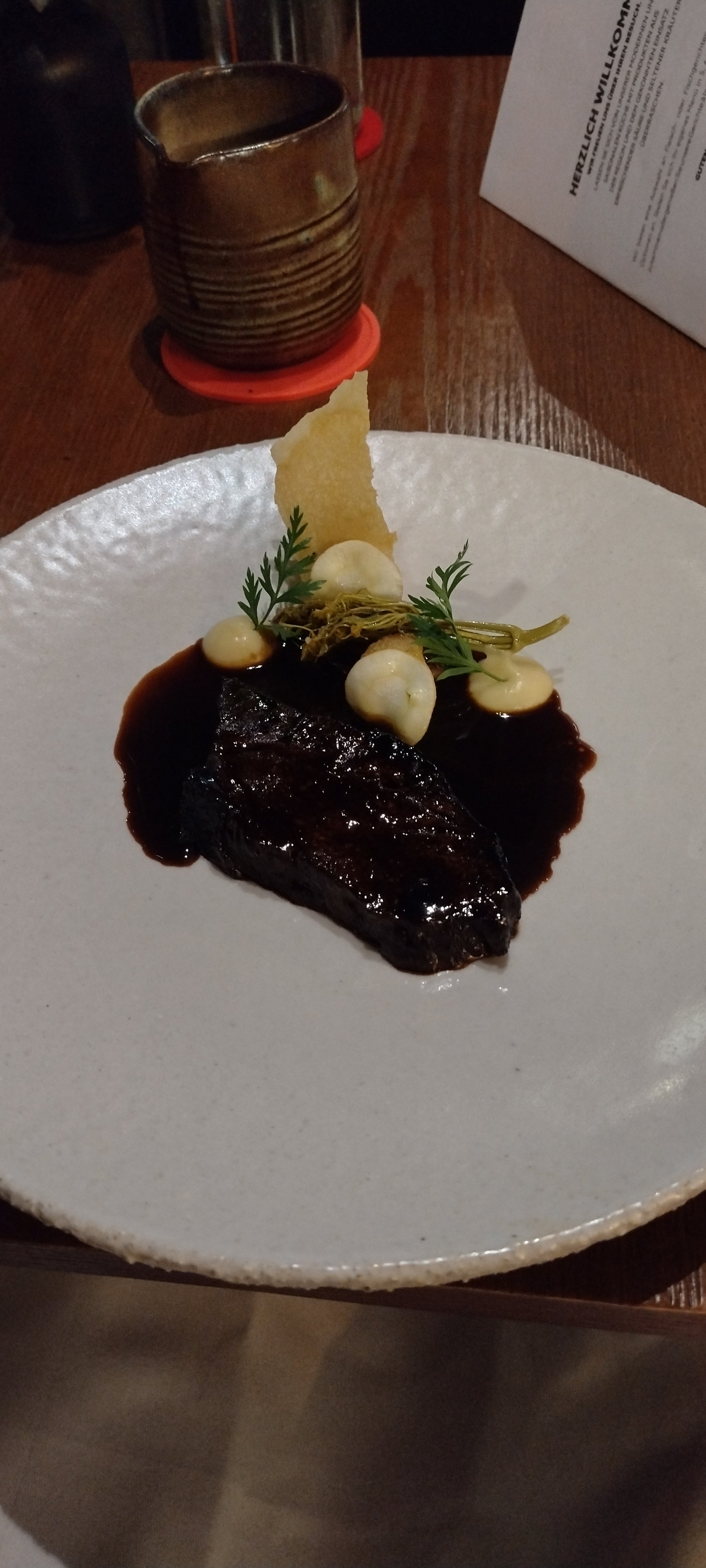 Deutscher Aal hat mich bislang selten (nie?) wirklich vom Hocker gehauen. Hier kommt eine Variante „Grün“ mit Senffrüchten und Petersilienschaum, dazu eine als Grätengebilde skulptierte Zwiebelmasse mit Aalfond und Aalcreme. Der Fisch ist von feinster Qualität, toll kross gebraten, mit einer wohlschmeckenden Haut. Das Drumherum kommt als eine wahre Umamiexplosion daher. Die Gemüsebasis wirkt erfrischend und schmeckt gleichzeitig angenehm süßlich; wieder ist der Pfeffer ausgesprochen gut dosiert. Die "Fischgräte" ist derweil unglaublich intensiv und würzig, sie haut den Gaumen beim ersten Bissen regelrecht um. Zusammen mit dem hier verarbeiteten Aal stellt sich eine beachtliche Komplexität im Geschmacksbild ein, wobei wieder Salz, Schärfe sowie Umami einen wilden und ansprechenden Tanz aufführen. Den in einer Karaffe dazugestellten Petersilienschaum trinke ich noch, so gut ist er auch solo. Aal in der deutschen Version habe ich bestimmt noch nie besser gegessen - und das, obgleich beispielsweise das Rutz das auch richtig gut kann (9). Als Hauptspeise wird geschmorte Ochsenbacke mit Pastinake, Ahorn und Feige serviert. Das Fleisch wird von einem treffenden Schmorgrad charakterisiert, aber auch hier sind es die Beilagen, die mich besonders beeindrucken - vor allem durch ihre interessante Aromatisierung. Zum Beispiel habe ich sehr selten so intensiv schmeckende Pastinaken probiert. Auch hier löffle ich die berauschende Sauce noch aus dem Behältnis auf dem Tisch, als der Teller leer ist (8).