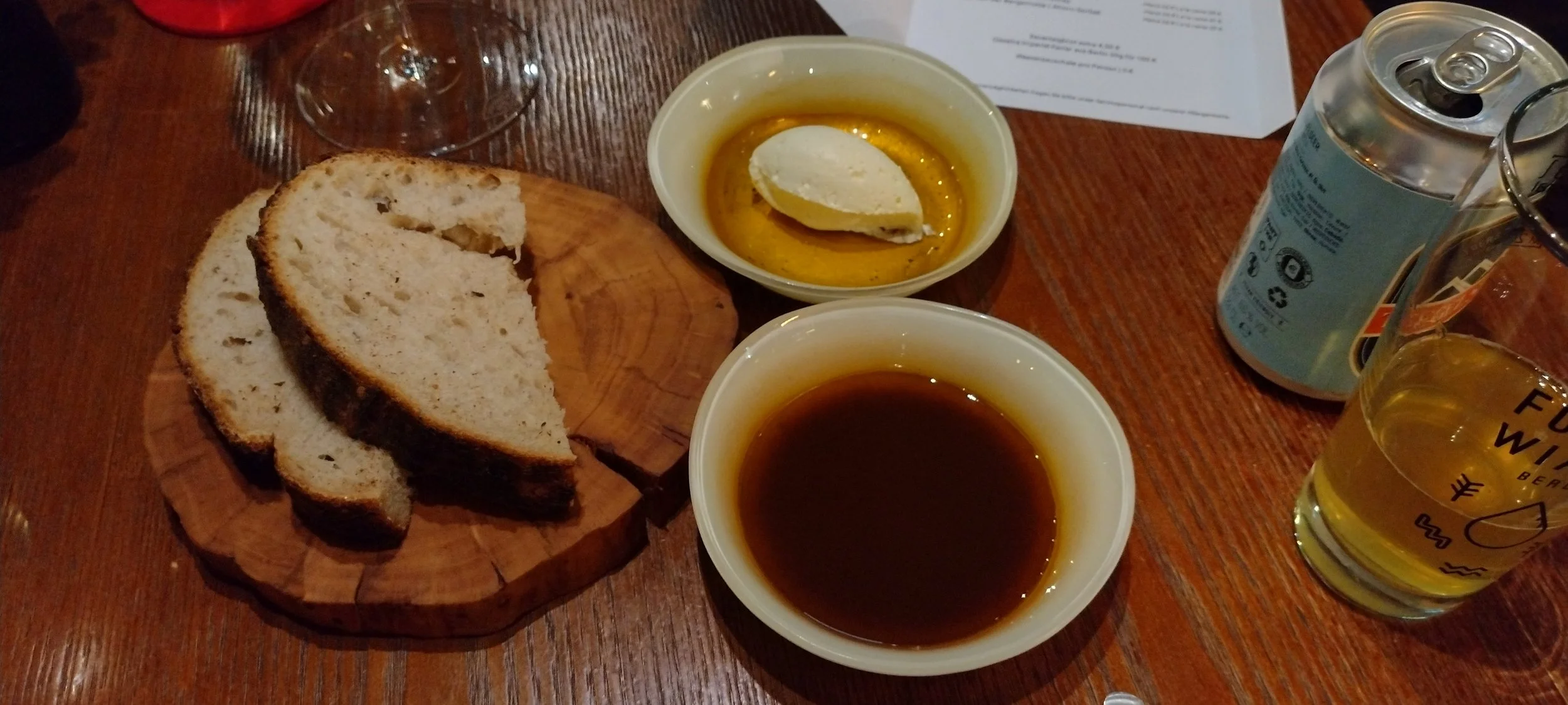 Dann folgt ein hausgemachtes Sauerteigbrot mit Salzbutter und Sauerbrotöl - explizit als eigener Gang. Das ist ein traumhaft intensives Brot mit schmackhafter dunkler Kruste. Die schaumige Butter kommt ohne besondere Features aus, aber die Zubereitung aus Traubenkernöl und Brotkrumen ist nicht nur sehr originell, sondern schmeckt wunderbar herzhaft. Das frische Brot tief in das Öl zu tunken (um die Krumen vom Boden mitzunehmen) und mit einem Tegelseer Hell von Fuerst Wiacek nachzuspülen - ein edler und zugleich bodenständiger Hochgenuss (9).
