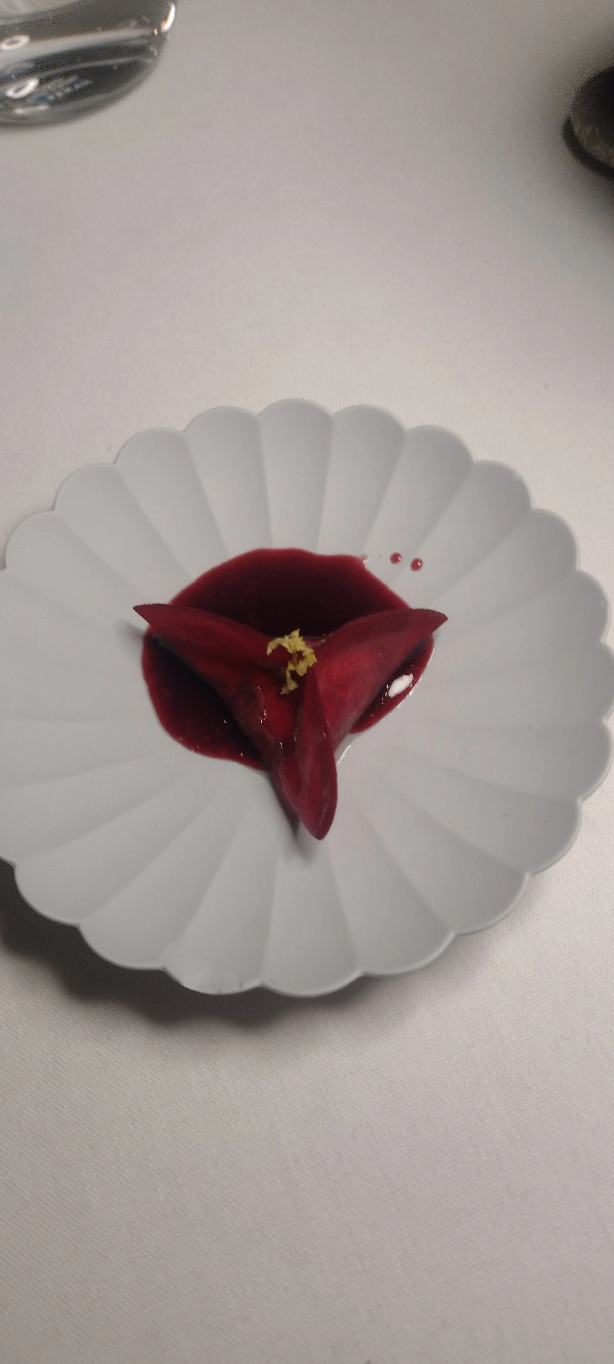Erste Starter kommen an den Tisch: Langos mit Schmand, Schnittlauch und Knoblauchchips - ein sehr großer, warmer Bissen, bei dem der Schmand anfangs eine angenehme Cremigkeit beisteuert, aber schnell von der teigigen, gedunsenen Substanz überlagert wird (6,5). Eine Croustade mit Kalb, Thunfisch und Kaviar folgt. Hier ist sofort der schöne Schmelz des Thunfisches da, wobei das Kalbfleisch gut damit verwoben ist. Alles klingt stimmig mit Umami aus (7). Die Ochsenschwanzbrühe liefert ebenfalls äußerst intensives Umami und eine gute austarierte Salzigkeit (7). Mit einem Rote-Bete-Ravioli mit Schalotten und Brombeervinaigrette hält eine schöne Frische Einzug in den Mund, und das mit harmonischen Bete-Noten und einer anhaltenden Pfeffrigkeit. Die Schalotten spielen eher im Hintergrund (7).