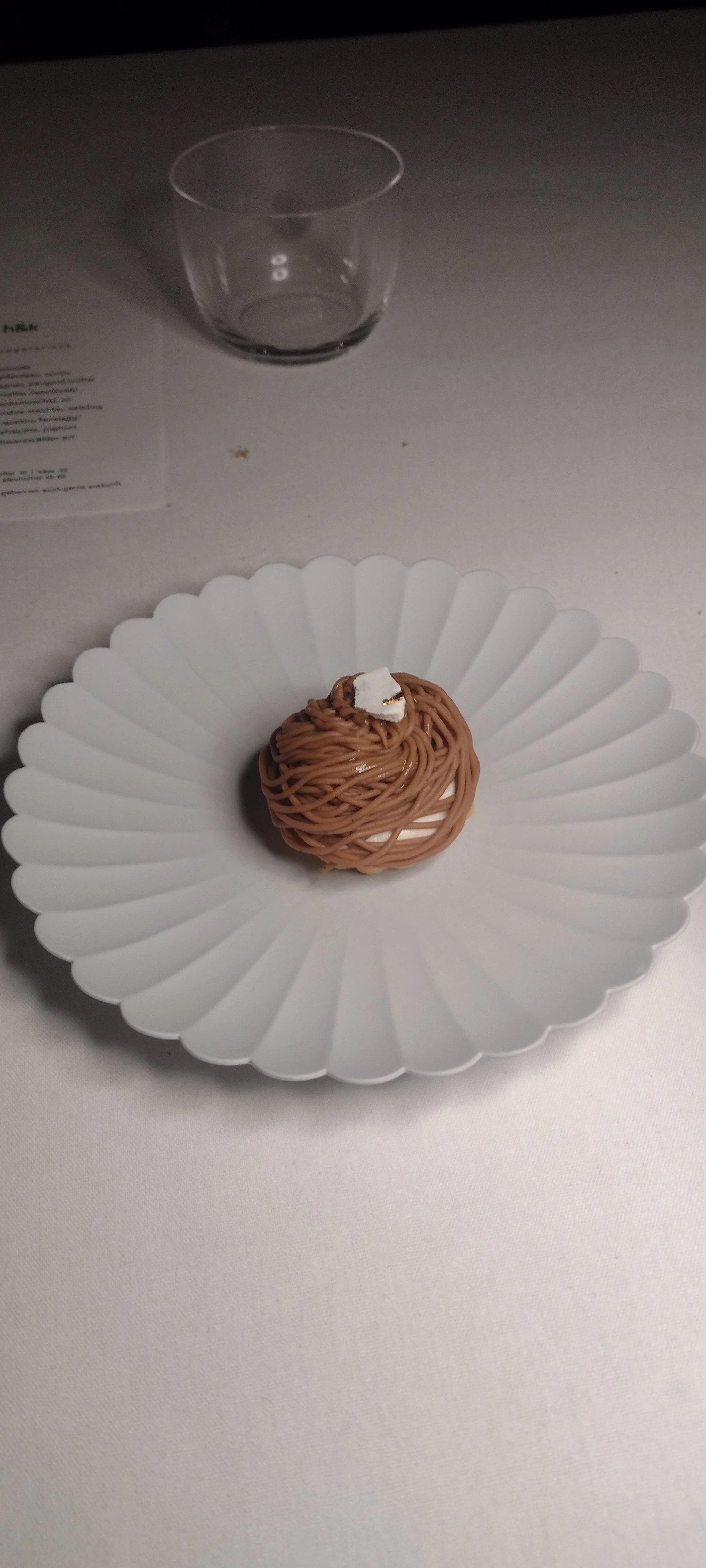 Nun bauen wir ein Gericht von der vegetarischen Karte ein - man kann da ziemlich flexibel austauschen: Selbstgemachte Spaghetti al limone. Die sind perfekt al dente, mit einem imposanten Zitrusgarten als geschmacklicher Kulisse. Da könnte man sich reinlegen, wenn die Portion etwas größer wäre (8). Ein Shiso-Granita gibt den erfrischenden, wenngleich unspektakulären Zwischengang (7,5). Die Hauptspeise, Wachtel von der Domäne Wachter, wird mit geräuchertem Saibling, einem Dashi aus Jakobsmuschel und Hühnchen, Spinat, Koshikari-Reis mit Saiblingskaviar, Beurre Blanc, gelaugter Brioche und vermutlich anderen Zutaten serviert, die mein Auffassungs- bzw. Erinnerungsvermögen sprengen. Zumindest stecken hier viele exzellente Elemente drin. Geschmacklich ist da weniger, als man vermuten würde, aber es ist immer noch ein vorzügliches Gericht, bei dem einzig der sehr salzige Reis ein wenig irritiert (7,5).