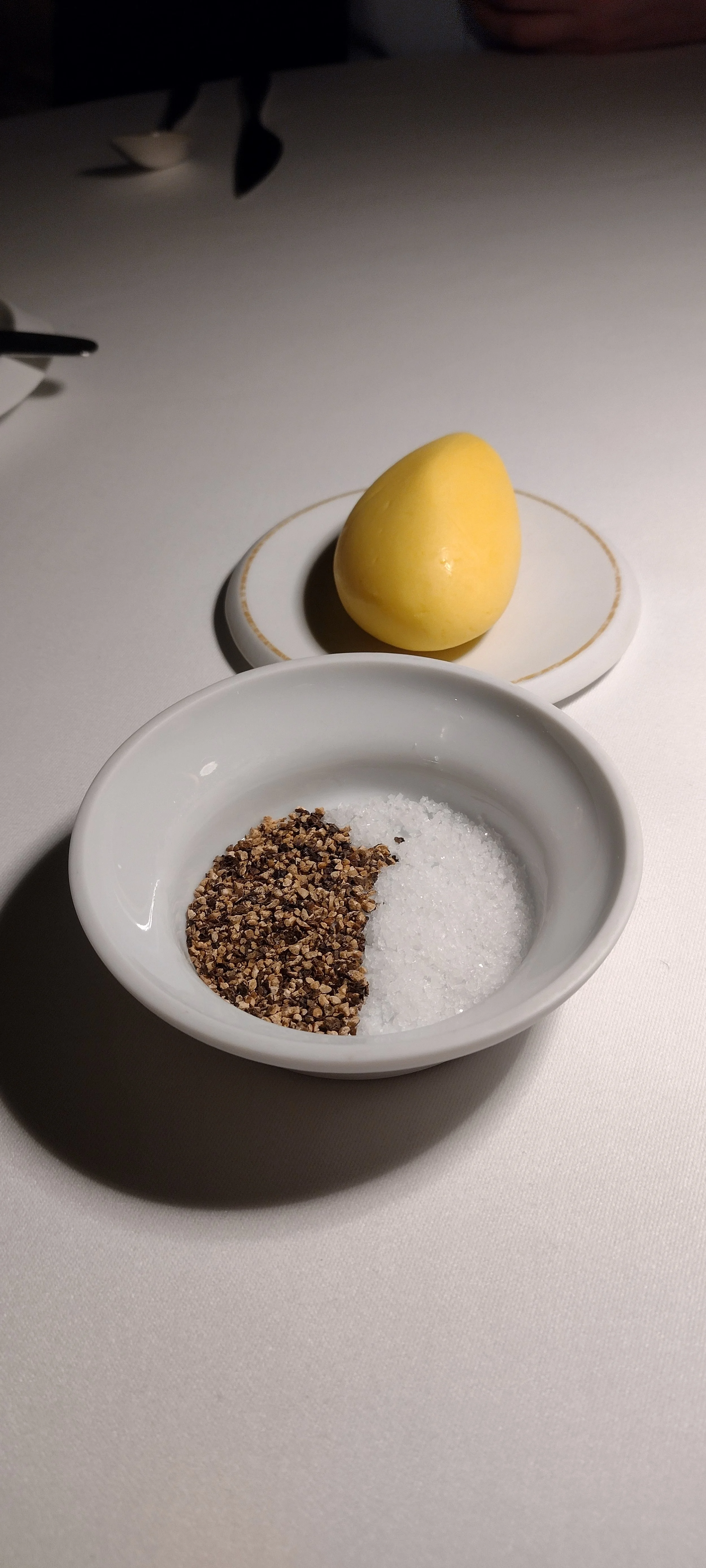 Brot kommt mit Butter, Pfeffer und Salz an den Tisch - alles hervorragend (8,5). Der nächste Gang ist kandierte Rübe mit süß-saurer Butter und Marigold. Hier ist eine schöne Süße ins einwandfrei zubereitete und geschmacksintensive Gemüse eingebunden. Das ist genau der gemüselastige, spinatartige Gang, den ich quasi geordert habe. Nur eine Person erhält ihn nicht: die, für die ich ihn explizit bestellt habe. Anyway: das Gericht ist nicht überaus spektakulär, aber angenehm (8). Dann kommt ein Comté-Soufflee mit Lauchminestrone und Coulis aus schwarzem Wintertrüffel. Das schmeckt wie ein klassisches Schweizer Käse-Gericht, mit erneut schöner Pfeffernote und sonst gar nicht so viel Geschmack (7,5).