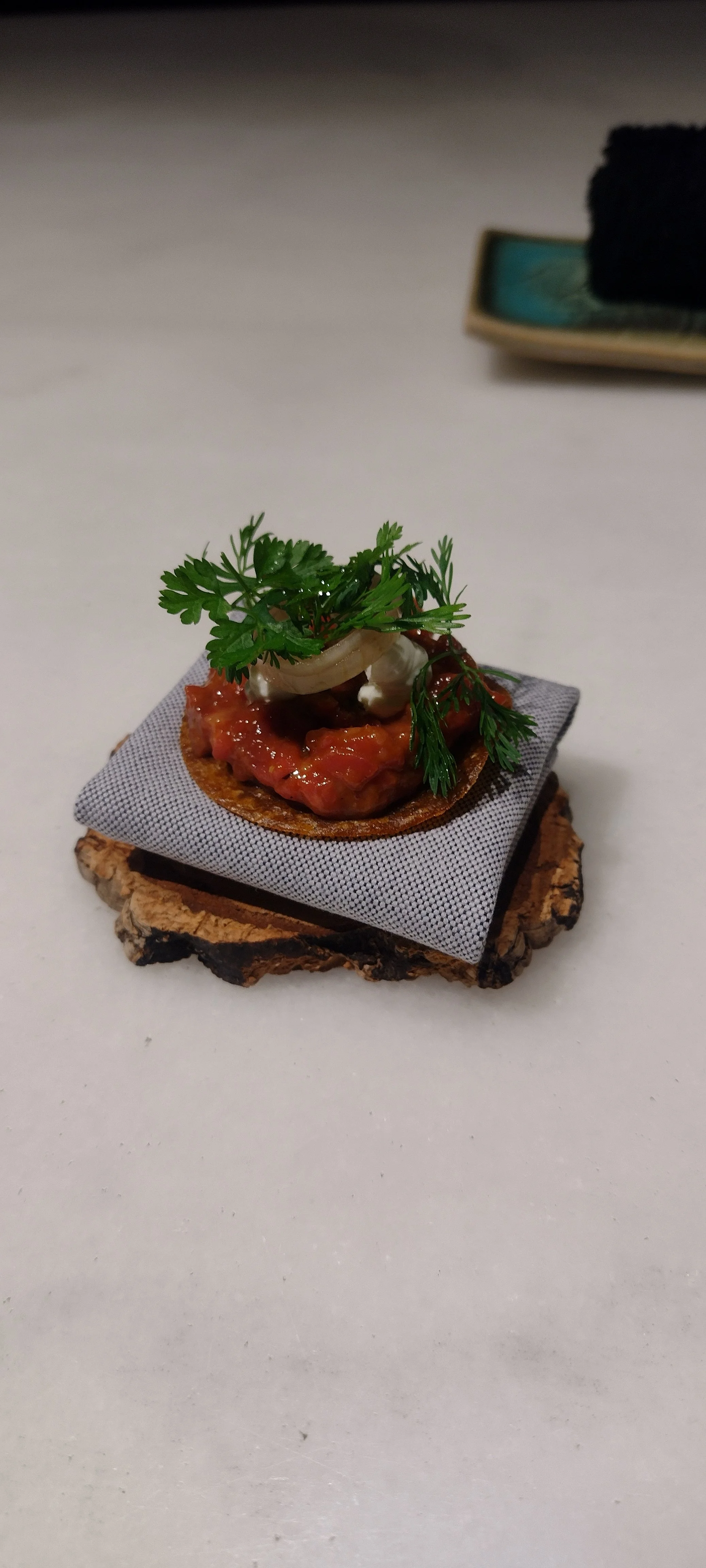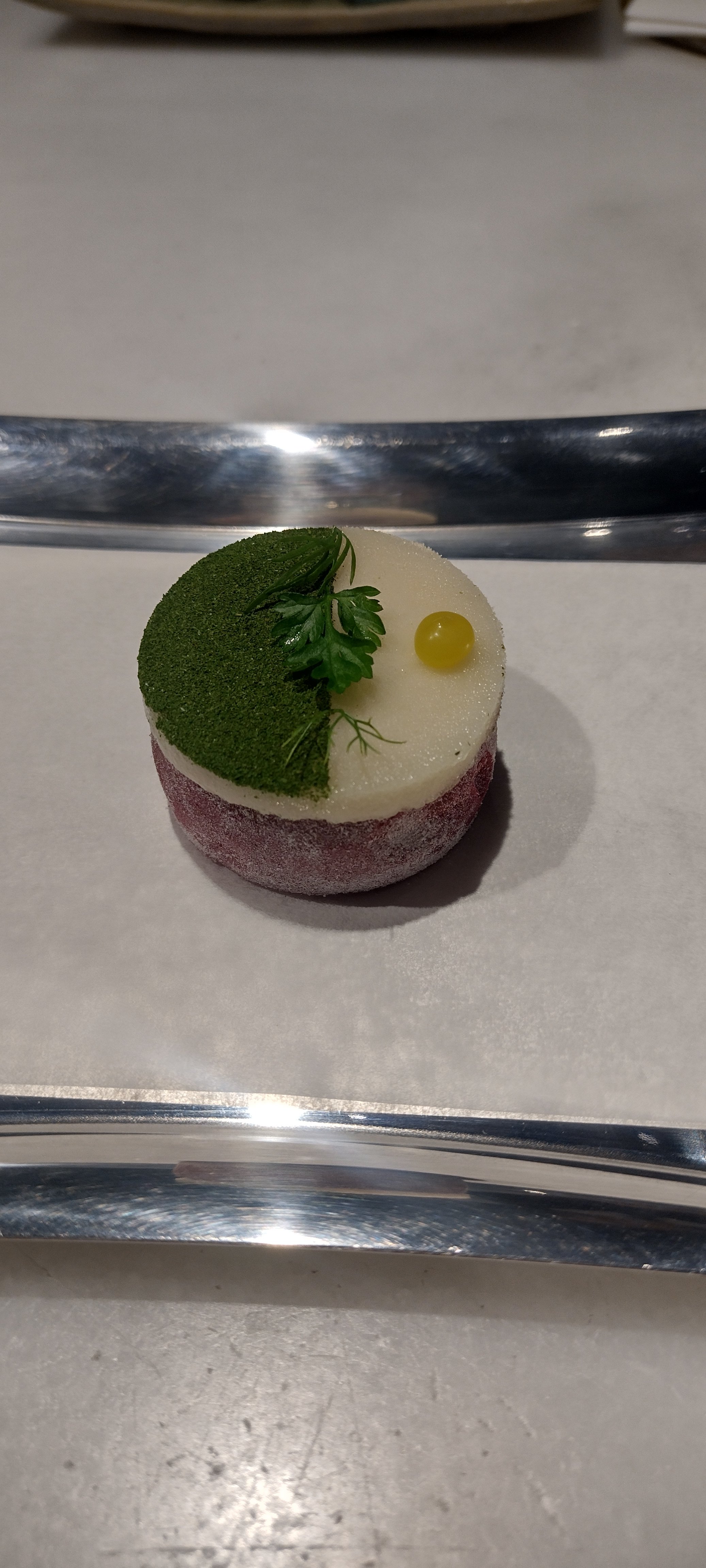 Nun tritt jemand ganz unvermittelt auf die Bühne, schnappt sich mein Josephinenhütte-Glas mit Cava und treibt mich in einen Nebenraum, dessen grundsätzliche Funktion sich mir bis heute nicht erschlossen hat. Es könnte der Pass sein, aber die Küche ist an anderer Stelle; vielleicht der Pass zur Patisserie. Anyway. Hier folgen weitere Gerichte, alles unter dem taxierenden und ungeduldigen Blick (m)einer Servicekraft. Sie lässt mich über die folgenden 3-4 Minuten nicht aus den Augen - als hätte ich potenziell vor, von hier zur CaixaBank zu verlegen, um Haus des Geldes nachzuspielen. Im mir gewährten Zeitslot folgen der Signature-Drink Hot & Cold Margarita (warmer Schaum und kalt drunter; originelle Idee, weniger der Geschmack; 6,5), eine Meringue mit Rote-Bete-Sorbet, Leche de Tigre und Korianderpuder (so kalt, dass meine paar verbliebenen Hirnzellen schockgefrostet werden, und deshalb schwer zu bestimmen; 6), ein Parmesankeks mit schwarzem Trüffel und Zitronencreme (man schmeckt nur Parmesan raus; 6,5) und Wagyu-Tatar mit Essig, Zitrus, geräuchertem Joghurt, eingelegten Zwiebeln und mexikanischem Koriander (sehr salzig und intensiv mit schöner Länge; 7,5).