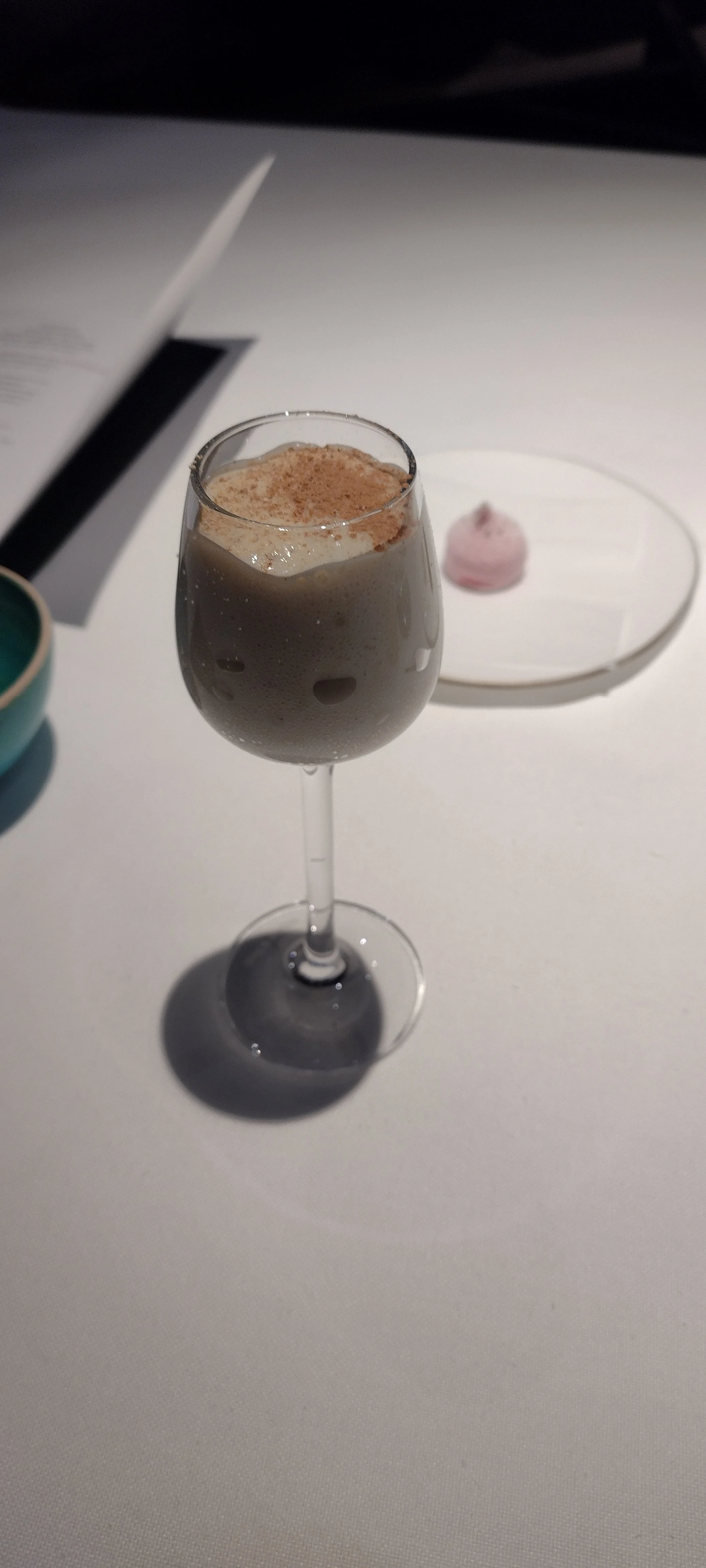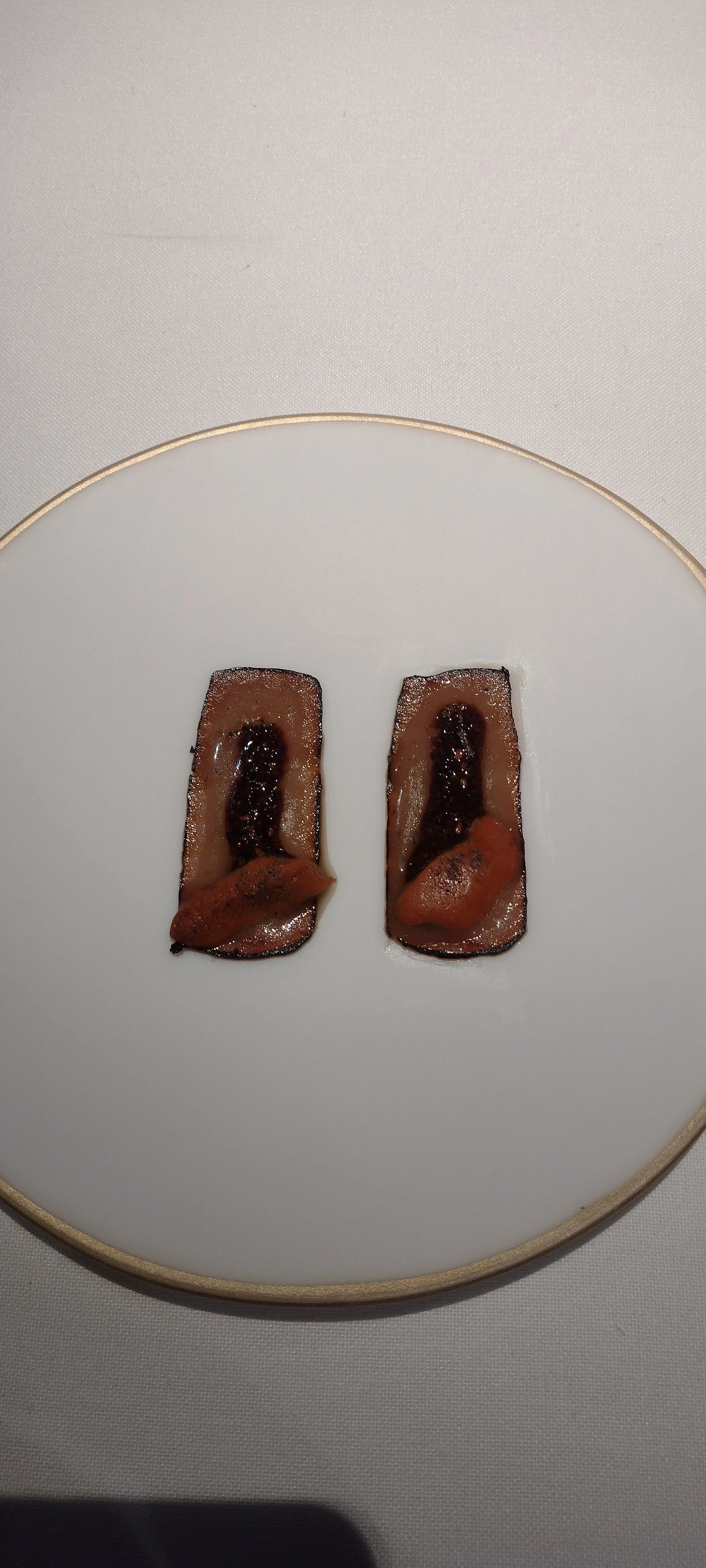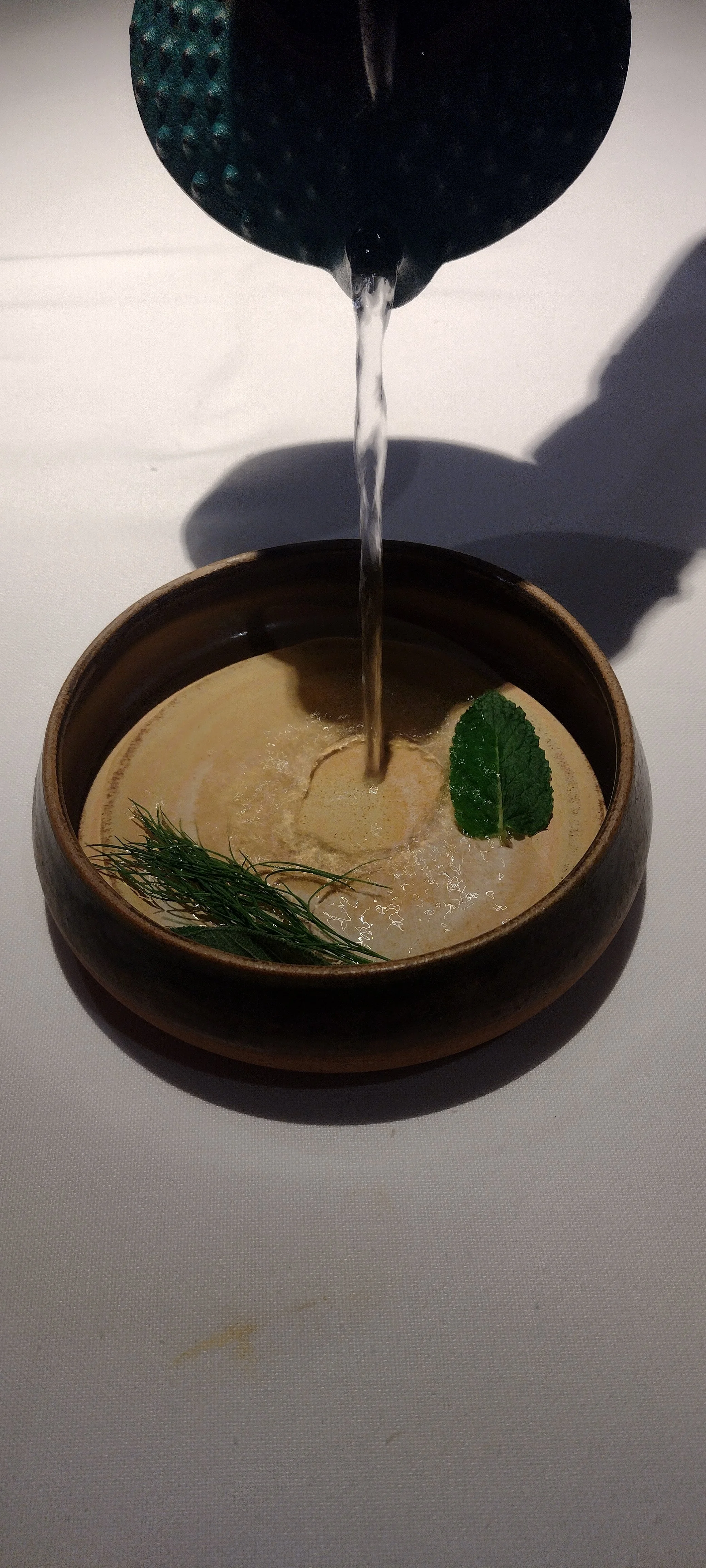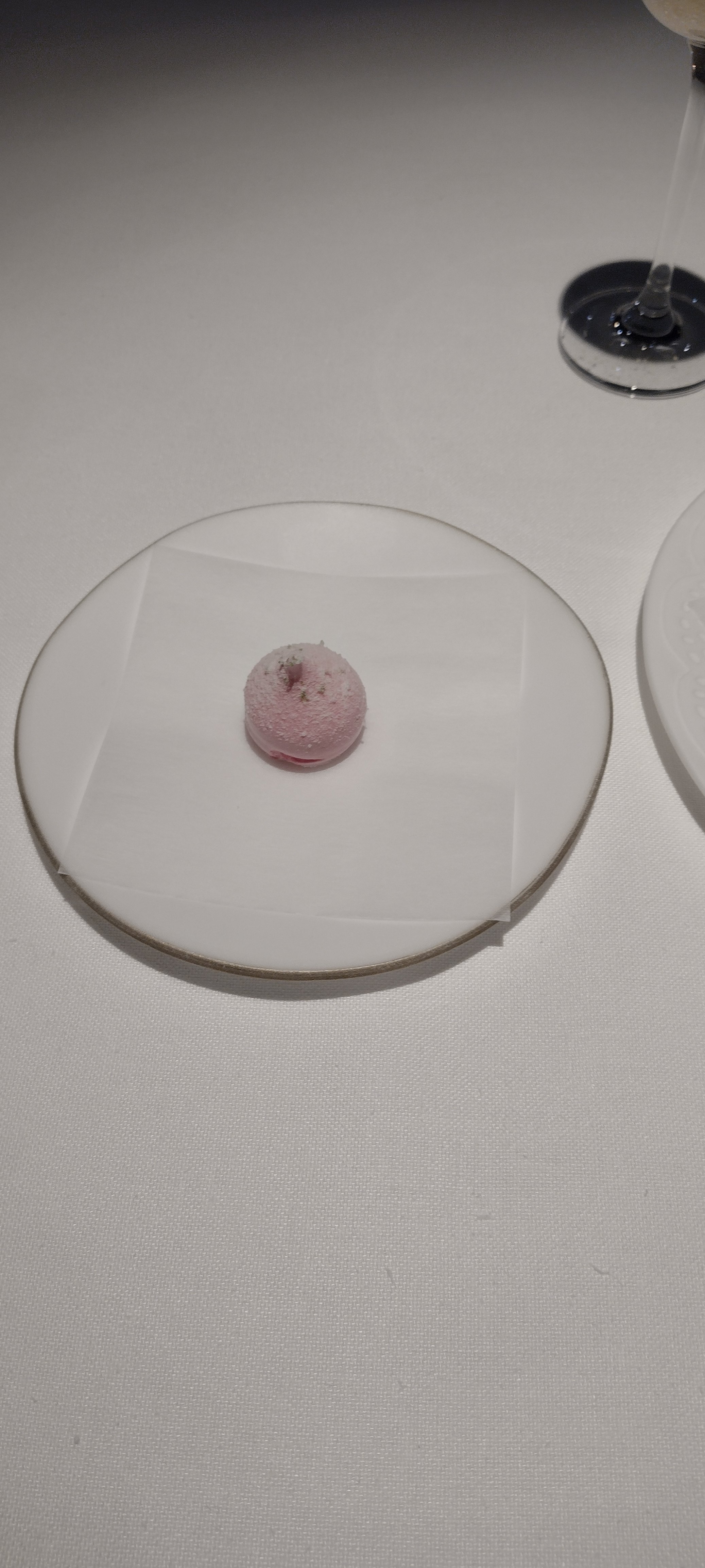 Den Beschreibungen zuzuhören, zu fotografieren, Notizen zu machen, vom Cava sowie vom Wasser zu trinken übersteigt meine Multitasking-Fähigkeiten bei weitem. Dazu noch der Zeitdruck - ich bitte immer wieder um Wiederholung der Beschreibungen und Nachsicht mit meiner Langsamkeit - und die gefühlte Überwachung. Im Ergebnis fühle ich mich zu Beginn des Menüs unter Druck gesetzt und gestresst. Das ist so ziemlich das Gegenteil von dem, was man in einem Gourmetrestaurant erwartet und wofür man bereit ist, viel Geld auszugeben (hier ist der Menüpreis im Einsternevergleich tatsächlich erstaunlich happig).