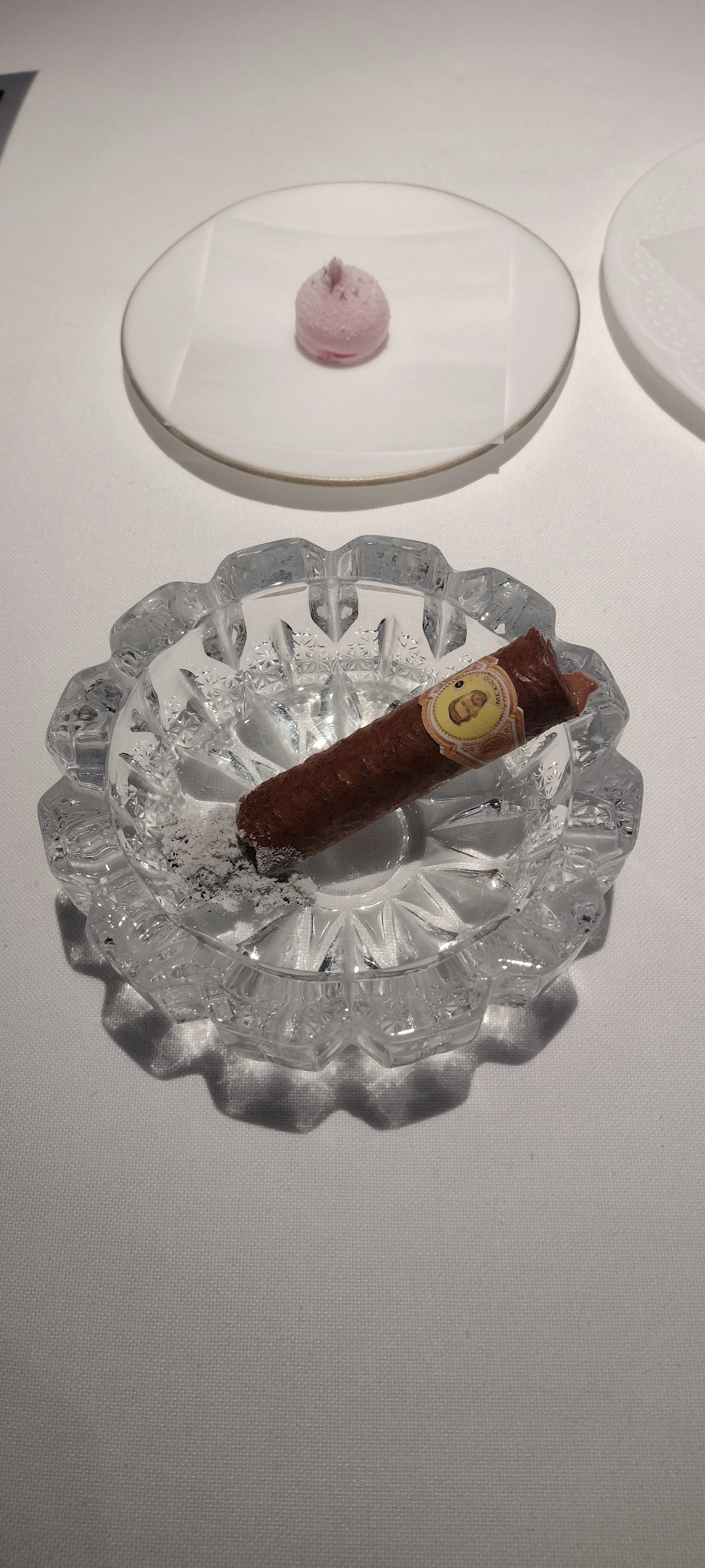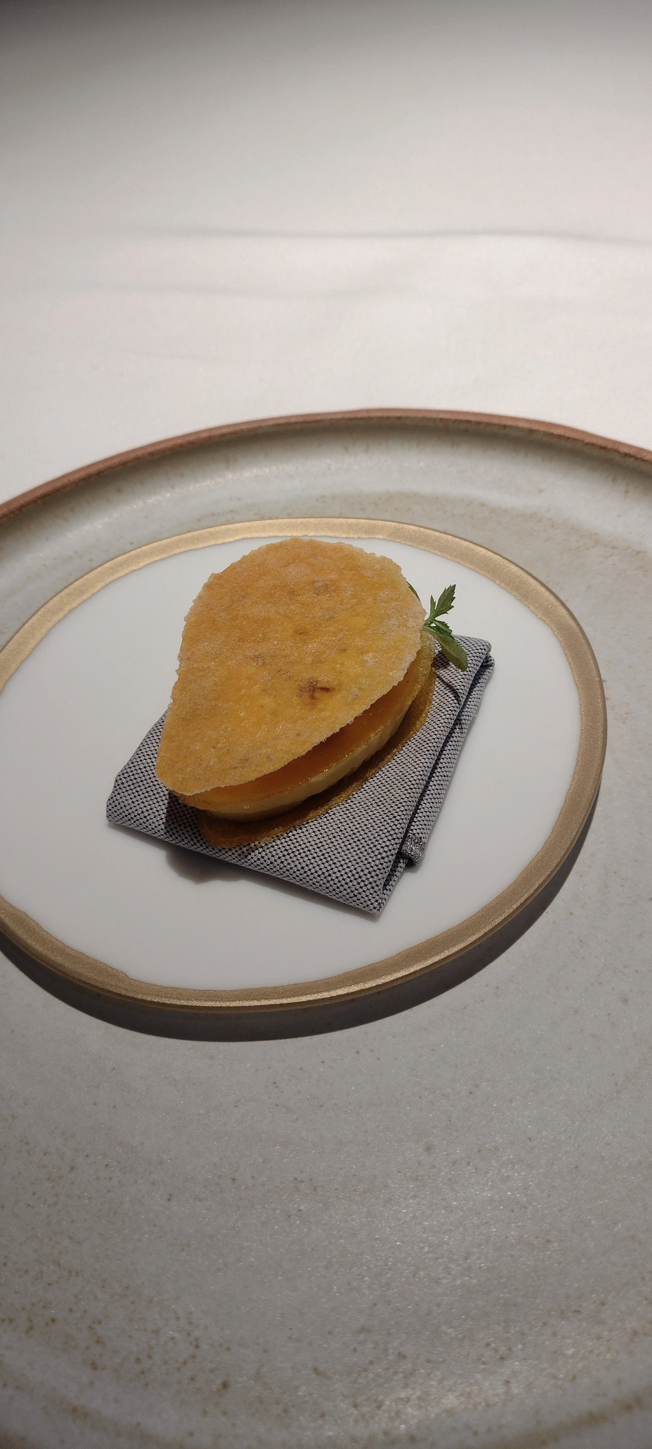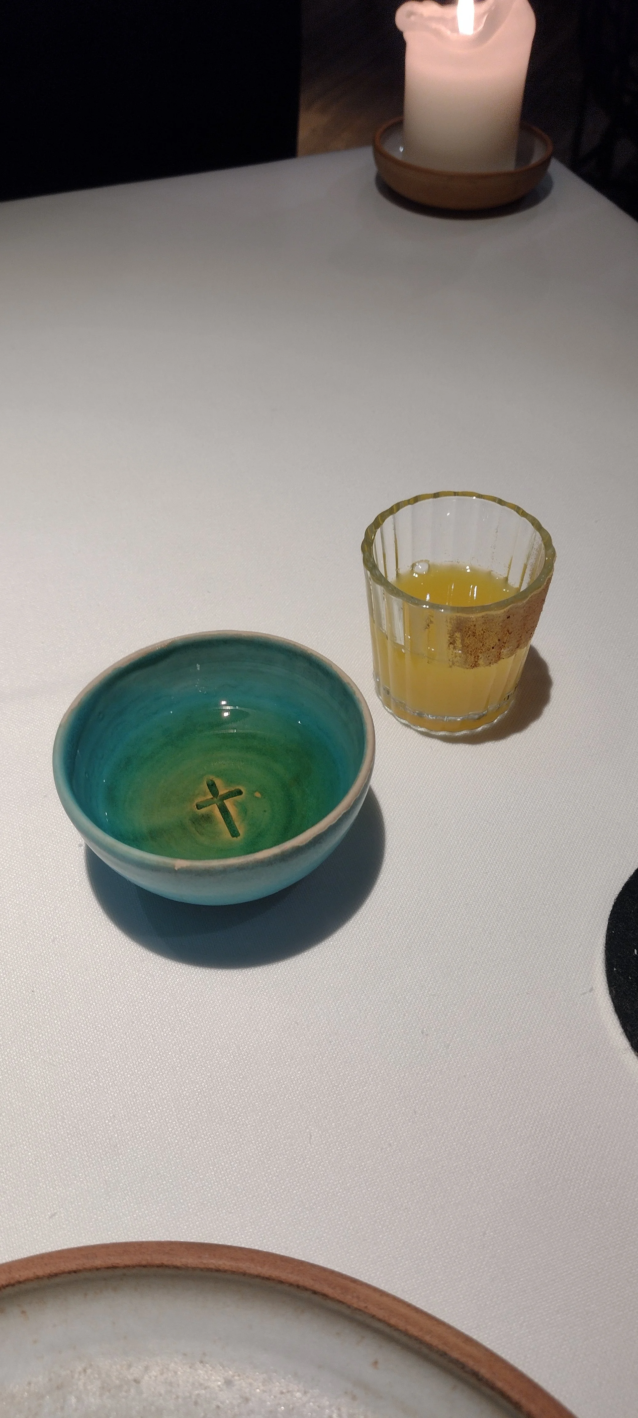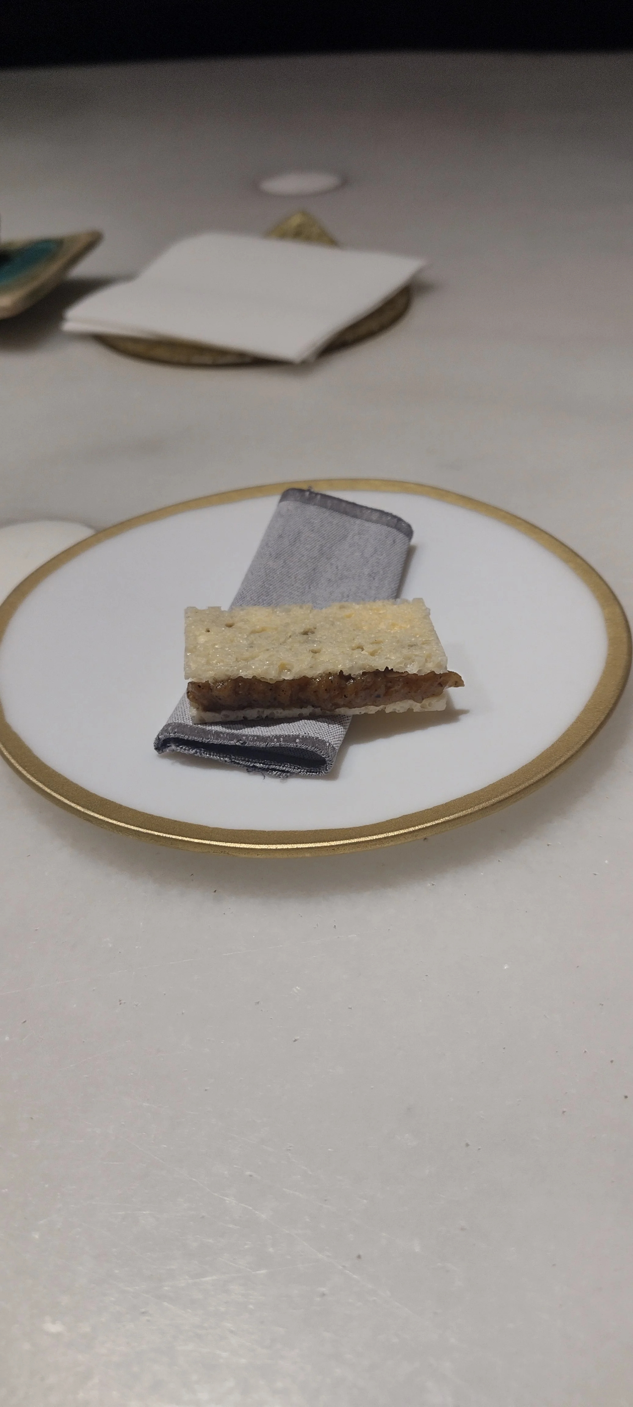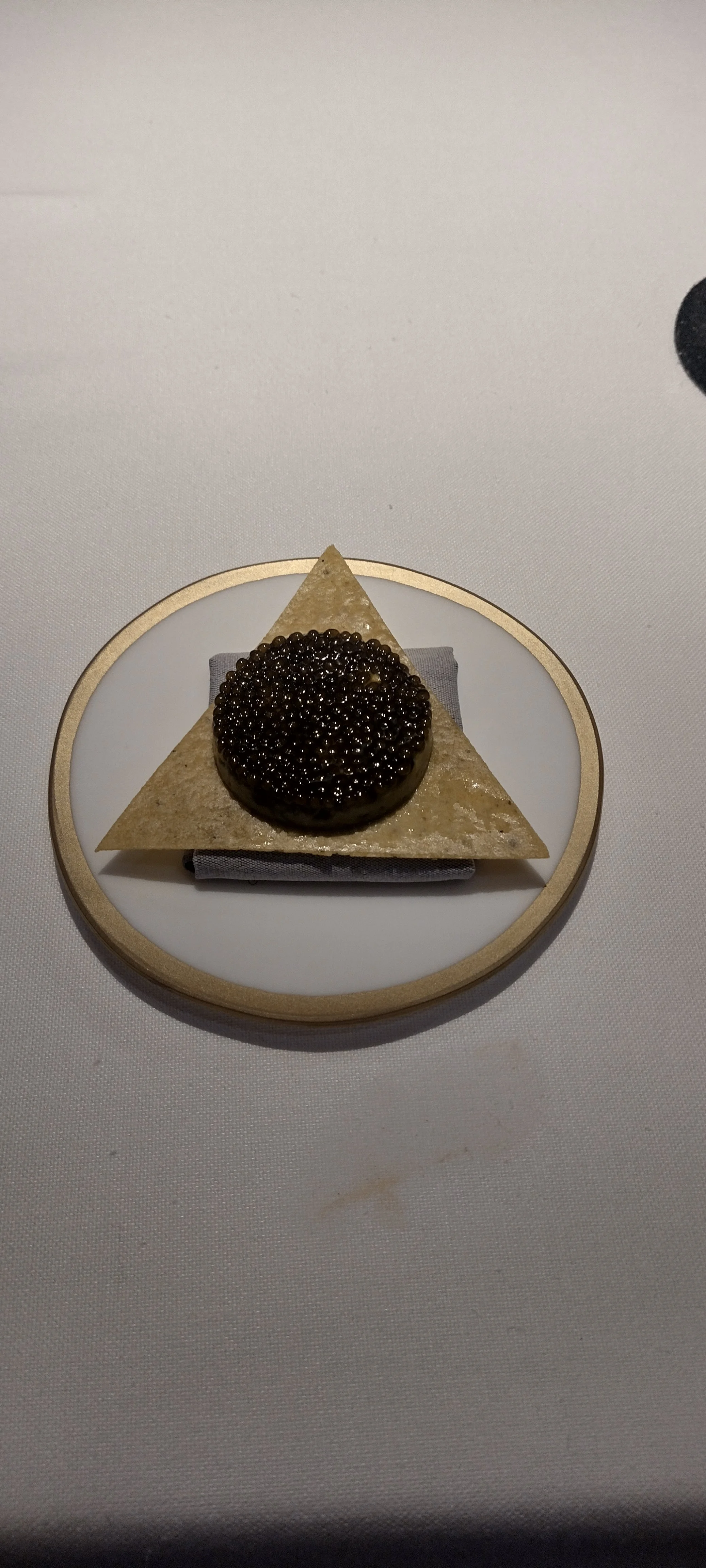 Den Beschreibungen zuzuhören, zu fotografieren, Notizen zu machen, vom Cava sowie vom Wasser zu trinken übersteigt meine Multitasking-Fähigkeiten bei weitem. Dazu noch der Zeitdruck - ich bitte immer wieder um Wiederholung der Beschreibungen und Nachsicht mit meiner Langsamkeit - und die gefühlte Überwachung. Im Ergebnis fühle ich mich zu Beginn des Menüs unter Druck gesetzt und gestresst. Das ist so ziemlich das Gegenteil von dem, was man in einem Gourmetrestaurant erwartet und wofür man bereit ist, viel Geld auszugeben (hier ist der Menüpreis im Einsternevergleich tatsächlich erstaunlich happig).