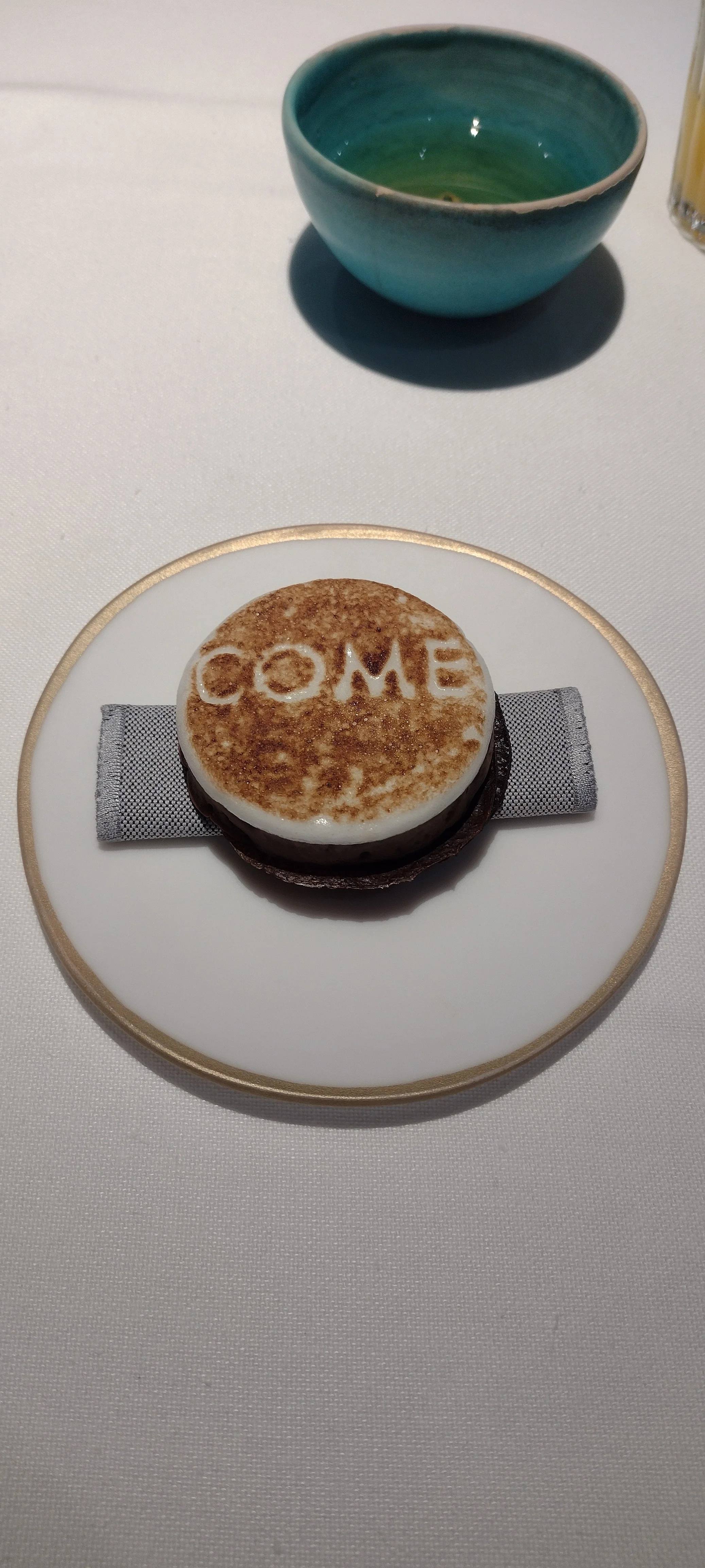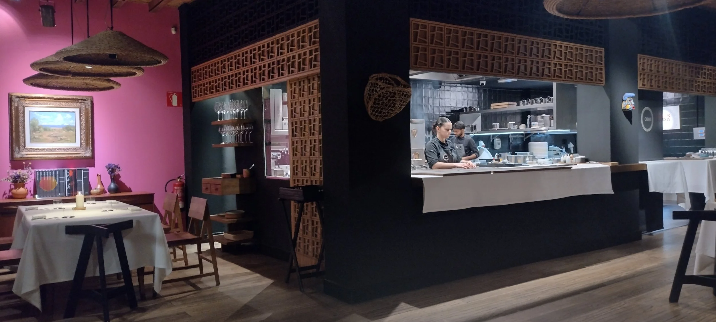 Jetzt geht es in den Speisesaal, wo ein Durchatmen möglich scheint. Hier trifft man auf nette mexikanische Reminiszenzen und Schlager im Hintergrund, aber auch unbequeme, harte Stühle. Indessen wird man relativ bestimmt gebeten, frühzeitig Bescheid zu geben, wenn man auf die Toilette muss - auf dass der Besuch genehmigt und terminiert werde. Der Hintergrund ist nachvollziehbar: das Timing der Gänge ist genau abgestimmt und die Prozesse sind logistisch anspruchsvoll durchgetaktet. Zumal im Come die Intervalle sehr eng sind. Gleichwohl gehe ich nicht in ein solches Restaurant, um meine (kurze) Zellenzeit wiederaufleben zu lassen. Dementsprechend setze ich den Geltungsbereich der Regel eigeninitiativ aus, was keine größeren Verwerfungen nach sich zieht.