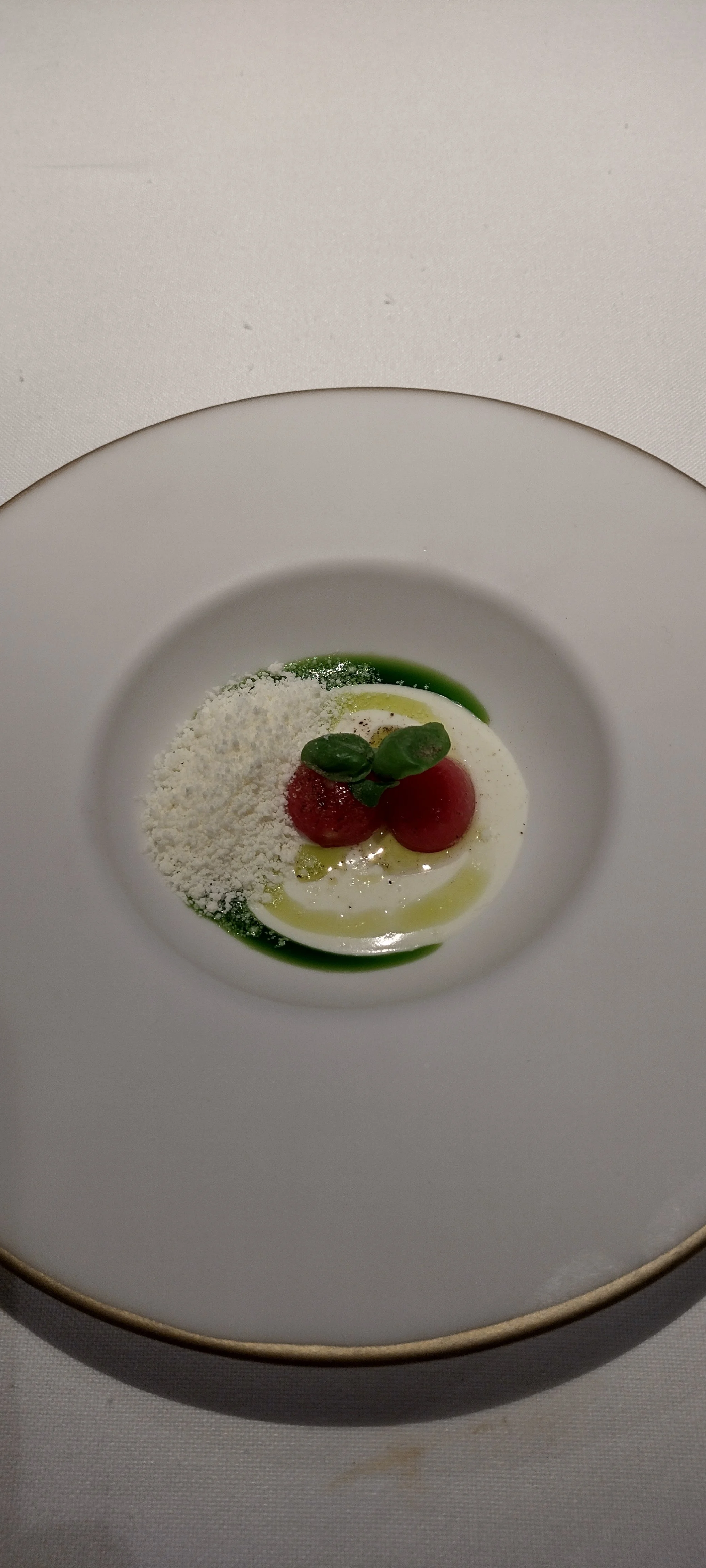 Zurück zum Essen: Der Hauptteil wird "SOMETHING OF MEXICO AND THE MEDITERRANEAN" genannt, was selbsterklärend auf den angestrebten Doppelklang beider Küchen hinweist. Dazu kommt zunächst "the World´s thinnest totopo", eine Tostada mit Avocado und Kaviar. Das schmeckt wie Nachos aus der Packung mit ziemlich uninspirierten Zutaten (5,5). Weiter geht's mit Thunfisch in Mole (eine traditionelle mexikanische Sauce mit oft Dutzenden Zutaten wie Chilis, Gewürzen, Nüssen und ungesüßter Schokolade) mit Seeigel. Angesichts des ausgezeichneten Seeigels und der Schärfe ist das wahrlich ungewöhnlich und überraschend. Würde ein Querschnitt der Bevölkerung hier bewerten, wäre im Spektrum 3 bis 10 alles dabei. Ich persönlich betrete damit eine faszinierende Geschmackswelt, die mit toller Würze ausgekleidet ist und lange nachhallt (9). Ein Duo von Salaten soll den Doppelklang der Küchen unterstreichen, wobei Caprese & Cesar eher nach Italo-US klingt - das muss aber nichts Schlechtes sein. Caprese kommt mit Basilikumöl, zweierlei Tomaten, Mozzarellacreme und Mascarpone. Das schmeckt tatsächlich sehr italienisch und solide, wobei Mascarpone eine stimmige Zusatznote abgibt (7). Cesar wird mit Hühnerhaut, Parmesaneiscreme und Sardellen serviert. Cremig und dumpf ist das, es wird im Nachhall allerdings besser, da die gut zubereitete Hühnerhaut zur Geltung kommt (6,5).