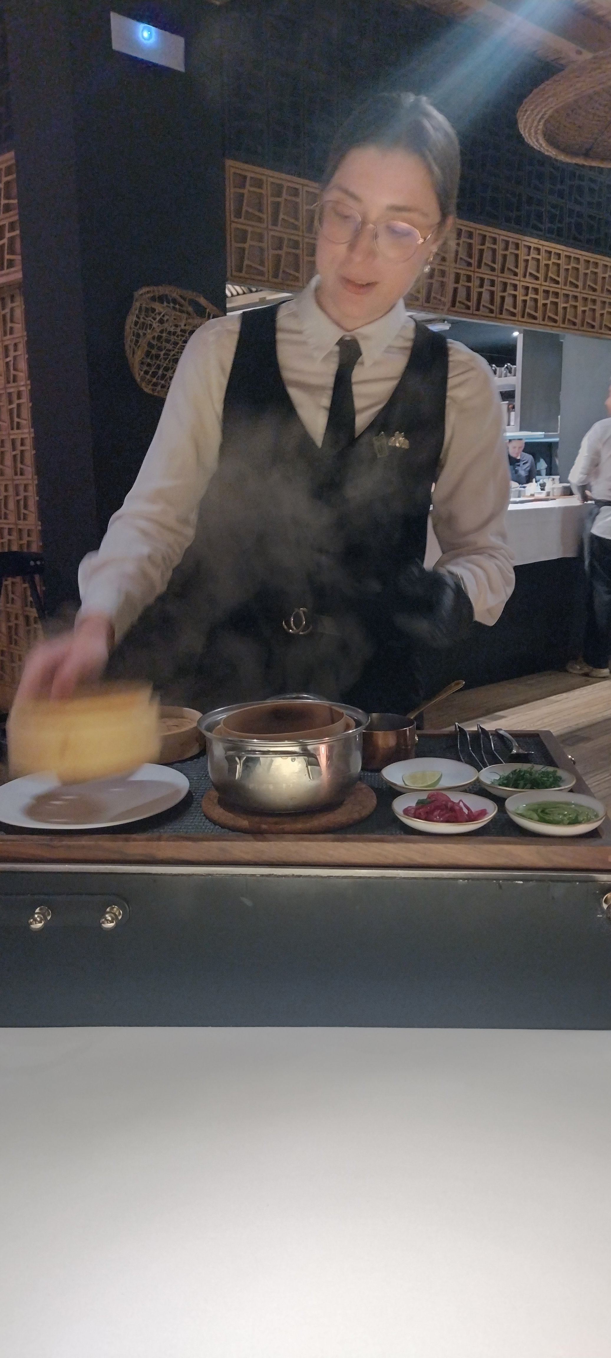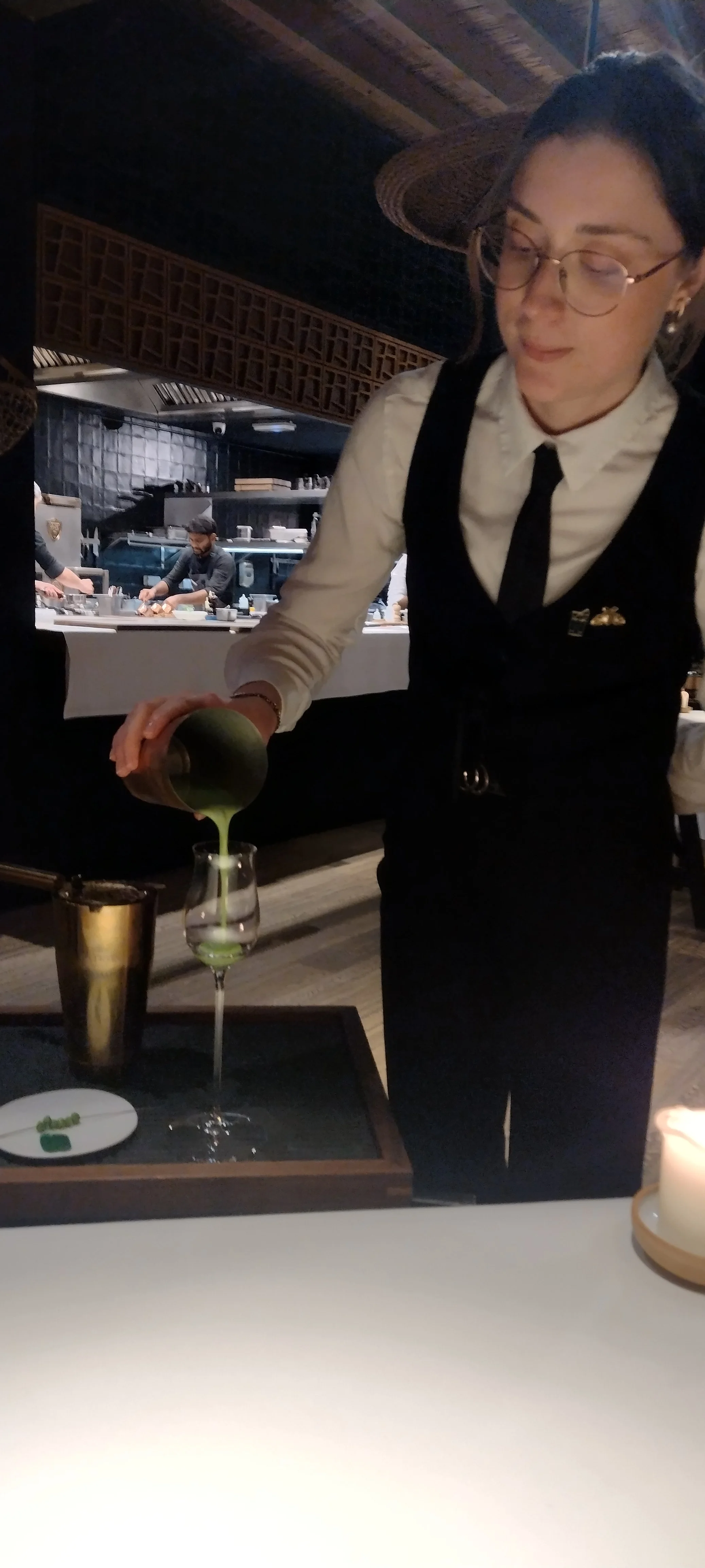 Wenn ich den Service resümiere, muss ich kurz klarstellen, dass meine Servicekraft - im Rahmen des von ihr vorgetragenen Programms - durchaus zugänglich war. Daneben stehen aber Unaufmerksamkeiten (Wasser wird schal, geringe Flexibilität in Einzelaspekten etc.) und vor allem das Gefühl, dass wir durchs Menü hetzen und ich unter ständiger Aufsicht stehe. Als wäre das ein lästiges Pflichtprogramm und kein schöner Gourmet-Abend. Mehr als ein halbes Dutzend Mal bitte ich darum, die Erklärungen zu verlangsamen und insgesamt etwas zu chillen. Beherzigt wird es nicht.