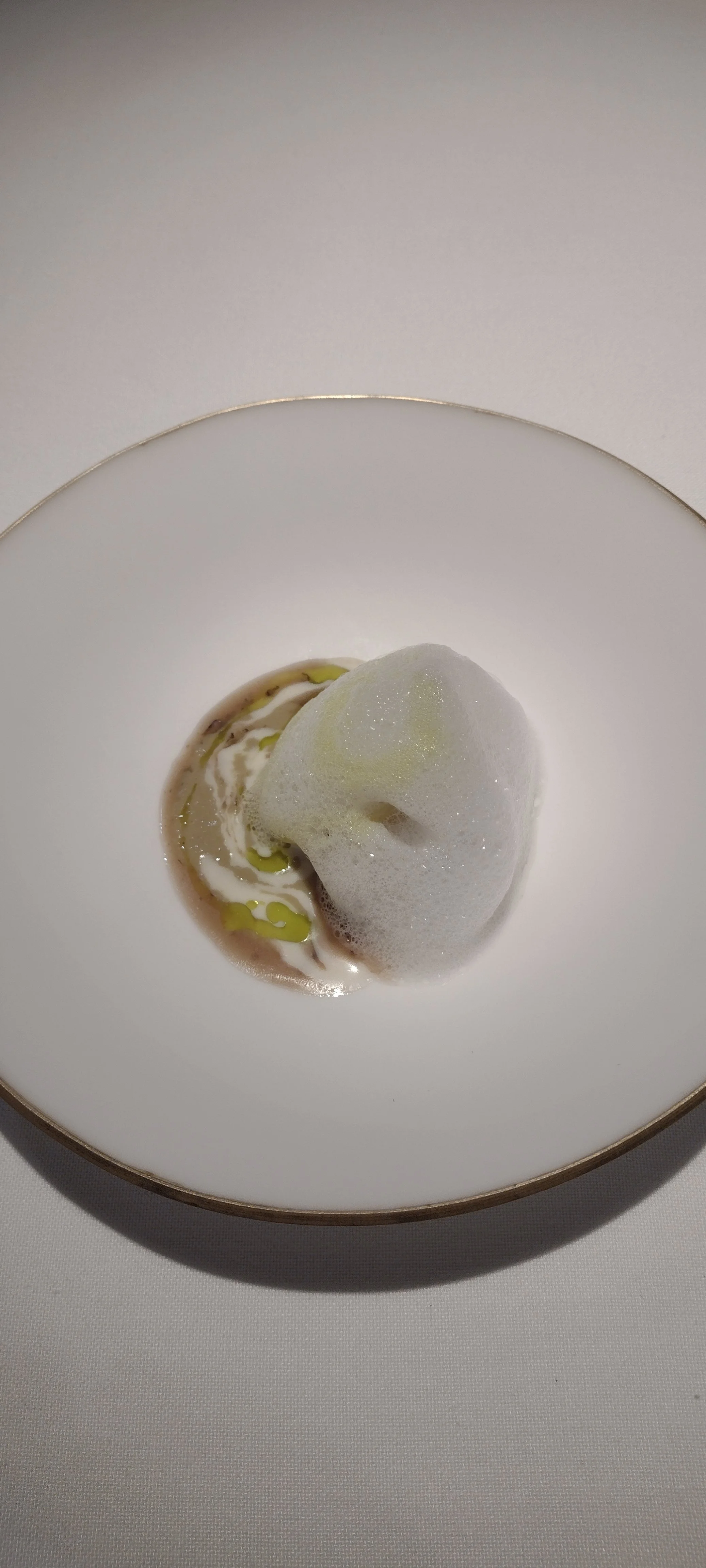 Der Trend zu Tellern mit einer Auswahl an Gemüse-/Kräutersorten, die vielfältige Geschmackskombinationen ergeben, hält auch hier an - mit "Thirty Greens". Das sind tatsächlich 30 verschiedene grüne, essbare Gewächse in unterschiedlichen Zuständen, die ich aufzählen würde, wenn ich a) meinen sadistischen Zug gegenüber den LeserInnen ausleben wollte und b) die Vorstellung nicht wieder rasant schnell abgespult worden wäre, was meine kognitiven Fähigkeiten sprengt. Zu dem Salat kommt ein Getränk: Erbsensaft, Dillöl, Eukalyptus und Limette sind da drin. Das dürfte der beste grüne Smoothie sein, den ich je getrunken habe, und insgesamt ist das Gericht die gelungene kulinarische Essenz der Farbe grün in intensiv und frisch (8,5). Der nächste Gang wird definiert durch vier verschiedene Pilzarten in einer Sauce und zwei als Sülze, Trüffel obenauf. Hier schwingt viel Umami und etwas Säure mit, es wird aber zu kühl serviert (7).