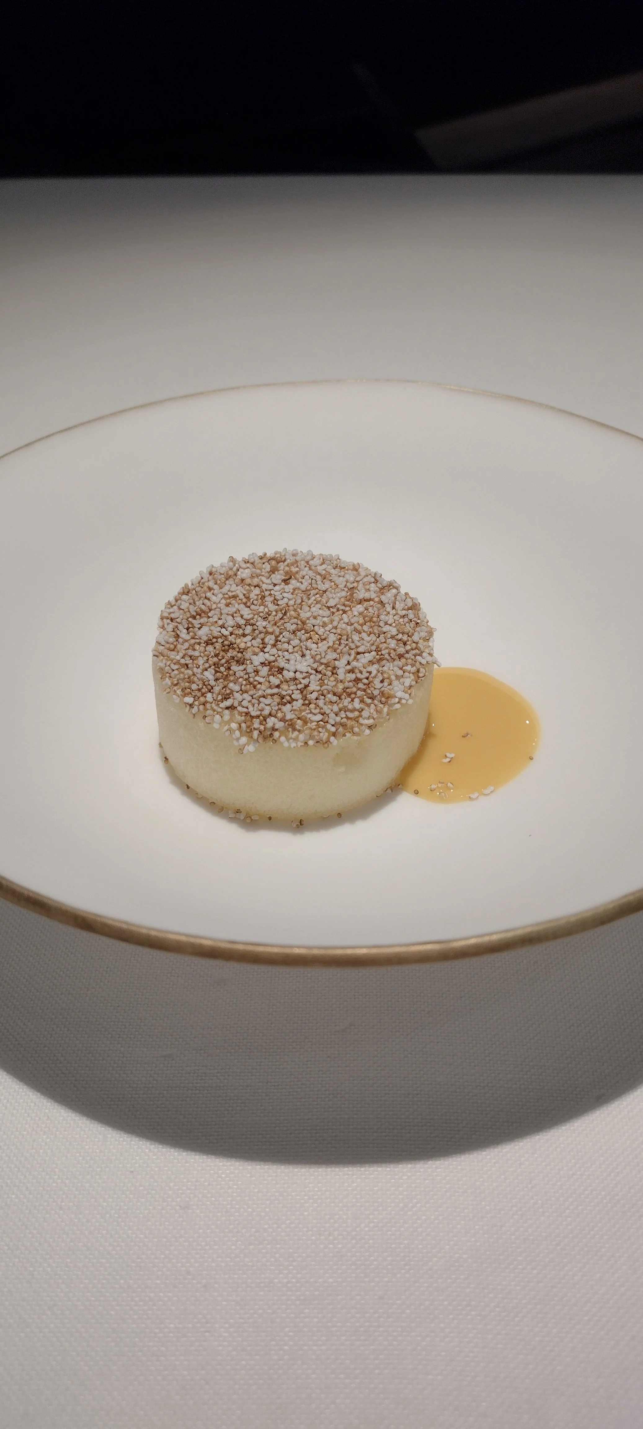 Darauf folgt das Predessert, eine Litschimeringue mit Tomatensorbet und Himbeeren, dazu ein Gel aus Feigenblatt. Das ist wieder so kalt wie eine Januarnacht auf dem Pico de Orizaba und zudem geschmacklich nicht wirklich stark. Eher nichtig, aber Props für die interessante Mischung mit der Tomate (6,5). Und dann geht es in die letzte Runde, die mit "Garibaldi" eingeläutet wird, gefrorenem Orangenespuma, dazu gebrannte Toffee-Creme, Puffamaranth und Orangennektar. Das schmeckt eher nach Predessert, aber v. a. durch das Toffee recht gut. In Erinnerung (wenn auch nur für die nächsten Stunden) bleiben die fluffige, in sich zusammenfallende Konsistenz sowie die prägnanten Amaranthkörner (7). Der nächste Nachtisch besteht aus einem Mango-Millefeuille mit Mangoeis, Quarkkäse, Kaffeepulver und Zitronenzeste. Das ist zunächst wieder deshalb ungenießbar, da es mit einer Temperatur am Tisch erscheint, von der ich nicht mal wusste, dass man Nahrungsmittel so weit runterkühlen kann. Die Bissen verursachen echte Schmerzen. Als sich der Eisnebel legt, kommen gut austarierte Noten der Einzelzutaten mit feiner Mango zum Vorschein (7). Das letzte Dessert besteht aus einer Kakao-Crunch-Nusspraline mit Mousse au Chocolat und Rosenwasser. Das ist geschmacklich sehr interessant: ein bisschen wie Tiramisu und auch was ganz anderes (7,5).