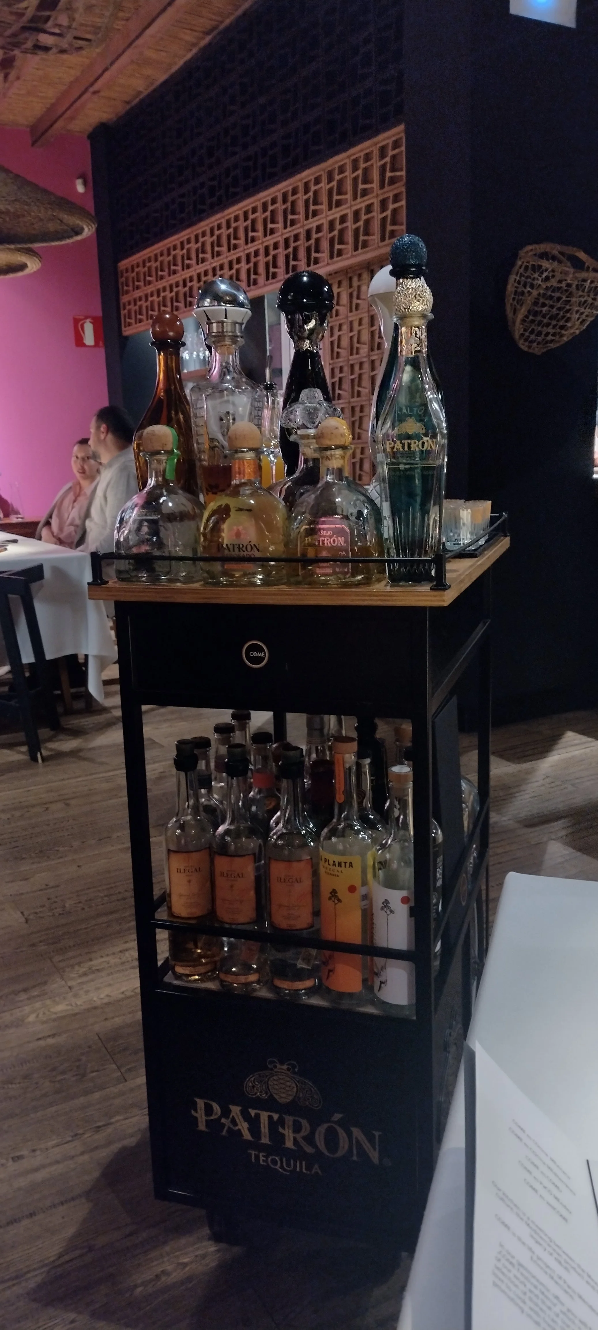 Ein sehr origineller - wenngleich eigentlich naheliegender - Servierwagen rollt an. Hierauf finden sich mehrere Flaschen mit Tequila und Mezcal unterschiedlichen Alters und unterschiedlicher Provenienz. Dass Mezcal klassisch mit frischem Orangensaft serviert wird, lerne ich jetzt.
