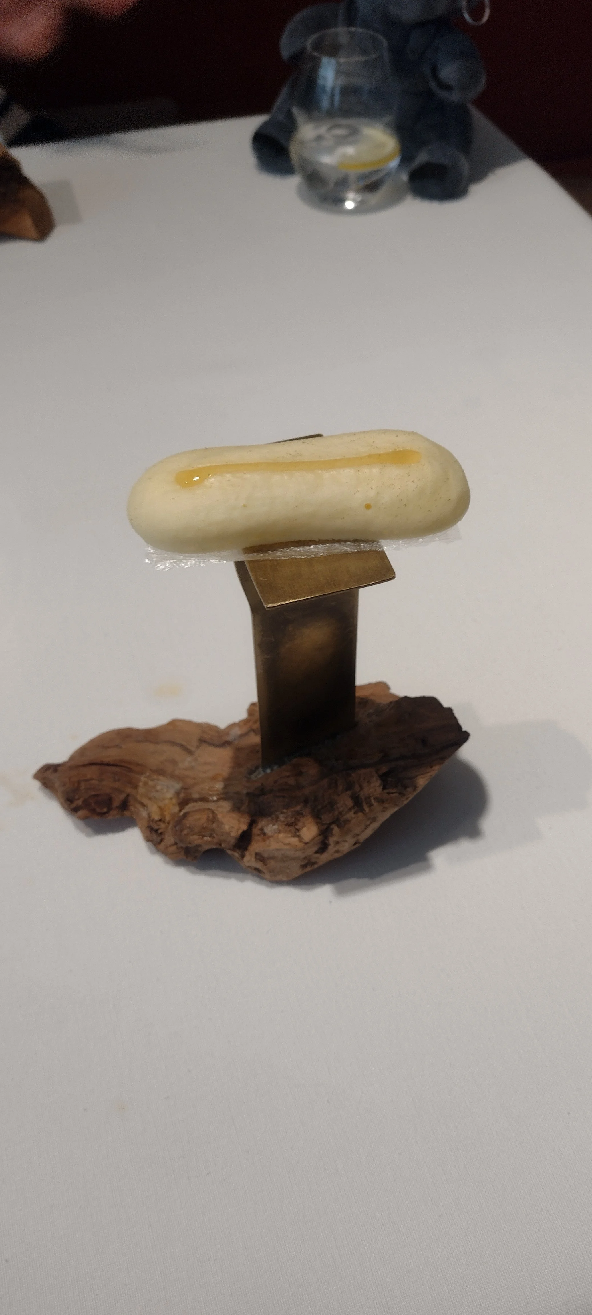 Ein weiterer Klassiker folgt: eine Brotscheibe mit geräucherter Butter und Kaviar - mit Lupe zur geneigten Inspektion. Die Butter kann ich in der Menge nicht essen, bin aber auch kein großer Freund dieses Nahrungsmittels (andere am Tisch lieben es). Die Brotscheibe ist unspektakulär, der Kaviar okay, im Gesamtklang bei kleinen Bissen auch ganz nett, aber irgendwie auch sehr seltsam. Zudem muss man einen - sehr kurzfristig anzukündigenden - Waschraumgang einbauen, denn die Finger liegen unter einer Schicht aus Butter verborgen. Zum ersten Mal seit langem esse ich etwas in einem Sternerestaurant nicht auf (6,5).