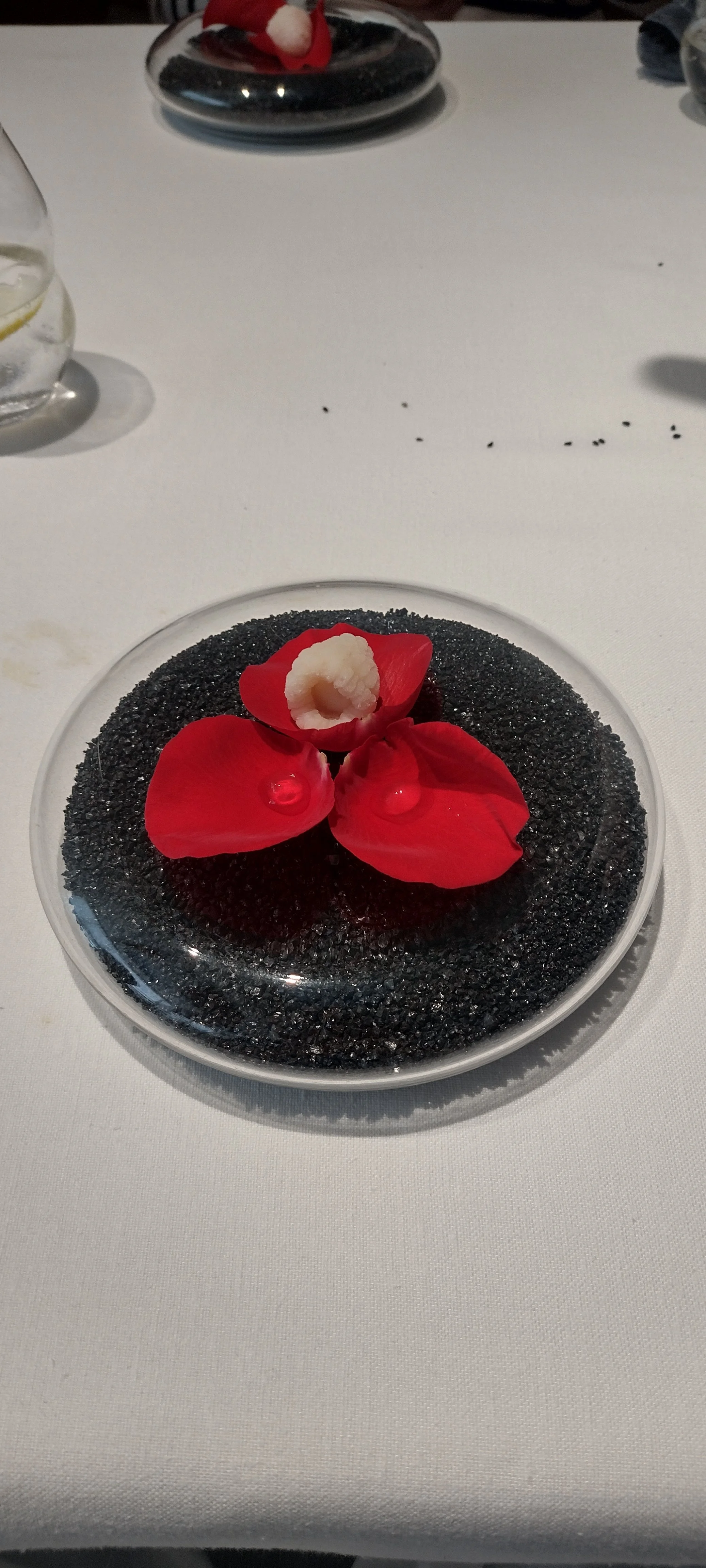 Den Einstieg bildet ein "Cocktail" mit Rum, Passionsfrucht und Minze, der in einer länglichen eisigen Form daherkommt. Ein erfrischendes, luftiges Eis, wenn man es so nennen will, mit ausgeprägter, sehr eleganter Minze. Ein bisschen schlicht, aber schön (7,5). Es folgt ein Gebilde aus Rose, gefrorener Litschi und getrockneter Bete. Beim Zerplatzen der Rosentropfen auf der Zunge entsteht eine interessante Konsistenz. Das Litschieis ist grenzwertig kalt, aber intensiv im Geschmack. Die Rote-Bete-Substanz zerfällt am Gaumen und ist eine Erfahrung, die ich so noch nicht hatte. Hier spielt auch eine gewisse Bitterkeit hinein (8).