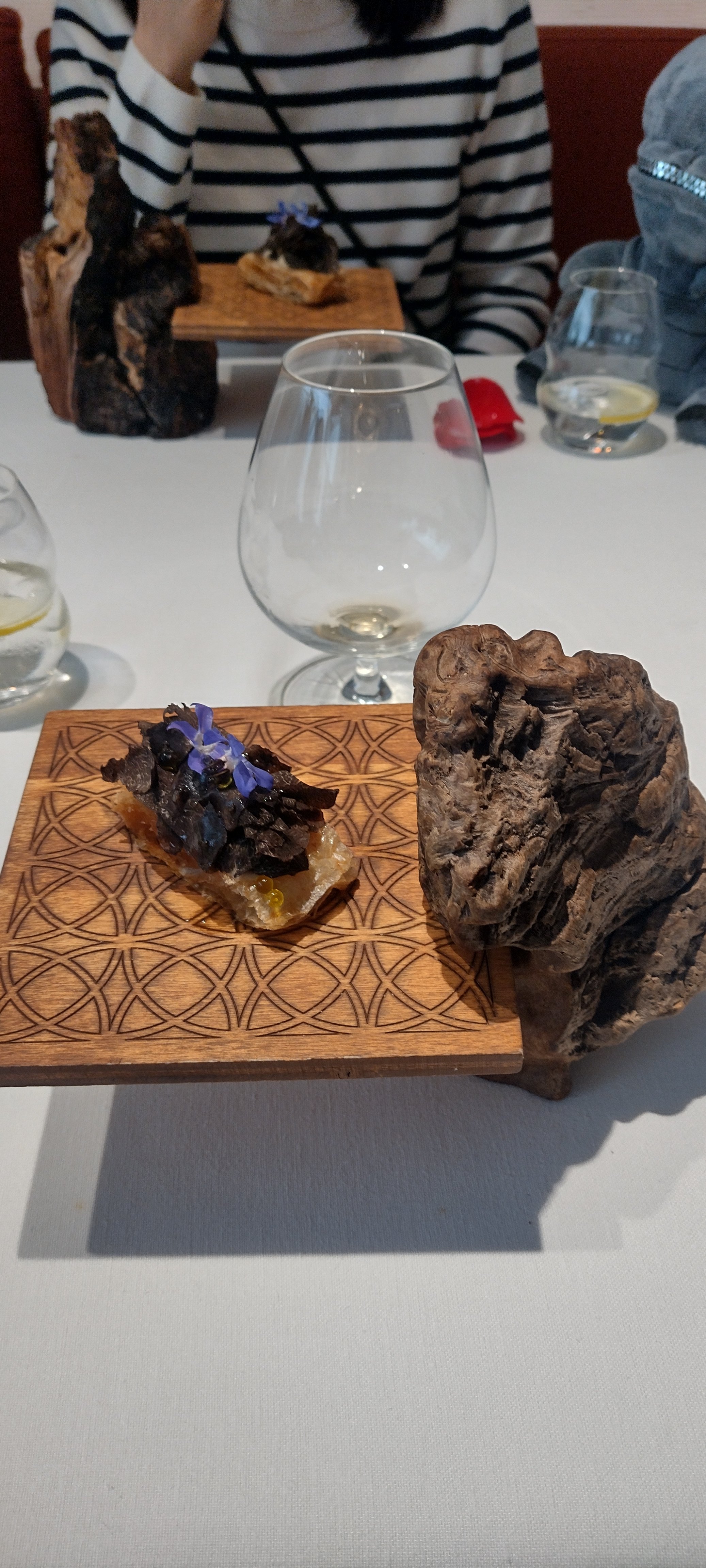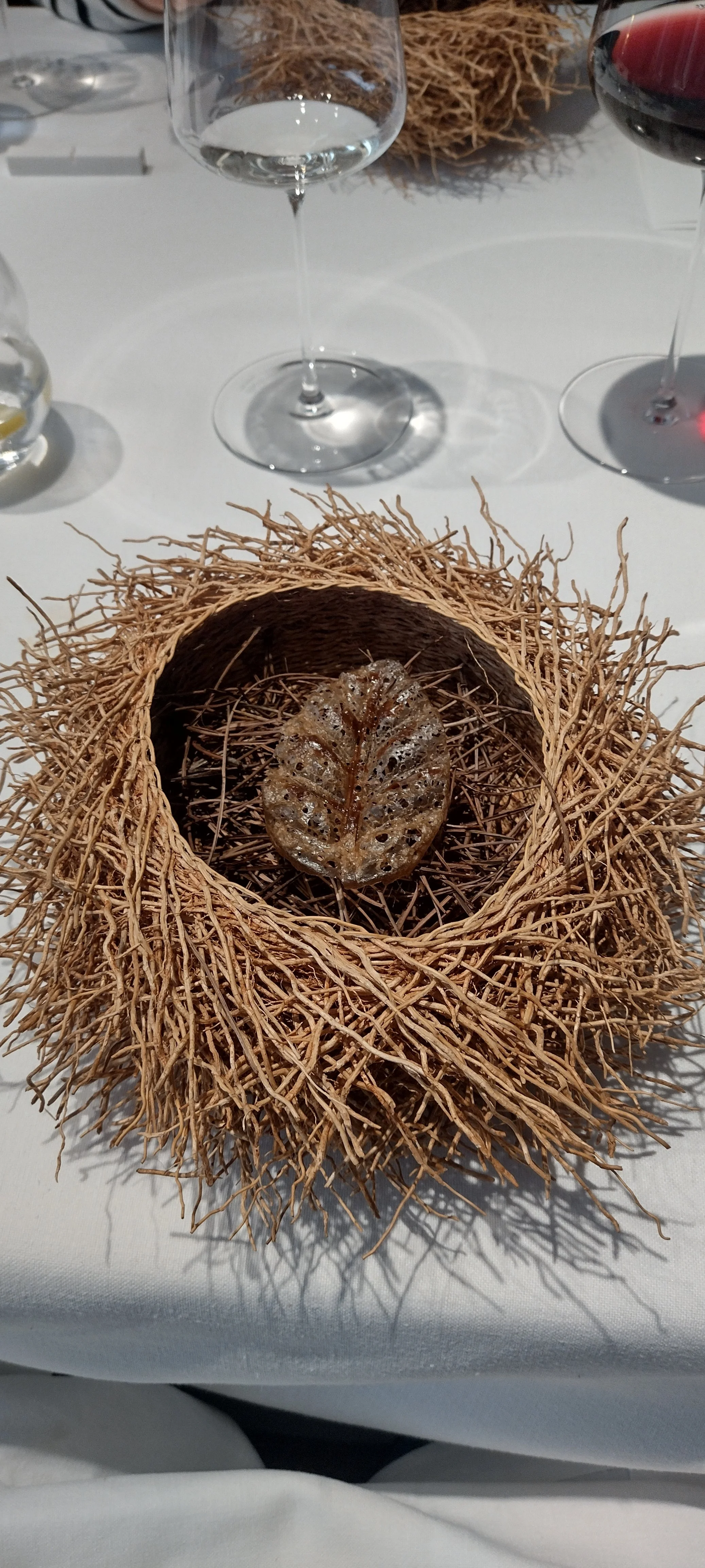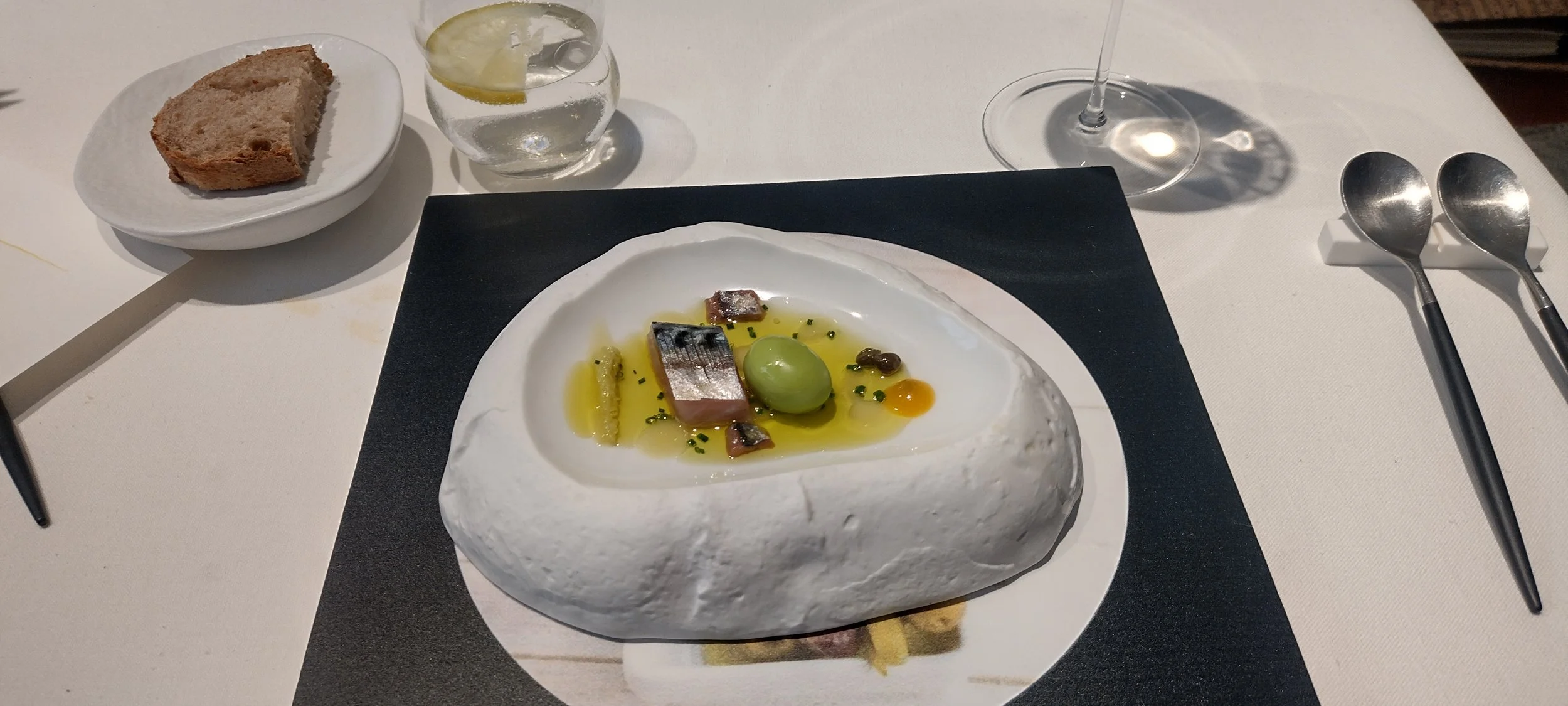 Und mit Klassikern geht es weiter: Gazpacho-Sandwich mit Sherry-Note, die man sich riechend aus einem - leeren - Glas einverleibt. Die Gazpacho-Füllung ist hochintensiv, das Baiser eher störend. Der Tomatensherrygeruch im Glas ist für mich eine sinnlose, die Nase reizende Spielerei, die keinen Bezug zum Gericht herstellt (7,5). Mit Olive, Pfeffer, Sardelle, Makrele und Brotscheibe geht es in die nächste Runde. Das scharfe, fruchtige und richtig tolle Olivenöl holt mich sofort ab, die Makrele etwas weniger. Die Olive löst sich in öligen, geschmacksintensiven Saft auf, während die Schale in ihrer Textur an BumBum-Eis erinnert. Insgesamt fantastisch (8,5). Dann wird es wieder schräg: Drei verschiedene Pilze, ohne Öl in der Mikrowelle zubereitet. Eine erdige Pilzessenz, welche den Nestcharakter auch gustatorisch abbildet. Ein sehr schönes, harmonisches Bild mit mittellangem Abgang und mittlerer Komplexität (8). Beim nächsten Gang muss man mitarbeiten und das Eigelb-Tempura erst anbeissen und dann ins Ei schütten, wo es sich mit einer Art dezenter Miso-/Sojapaste vermengt. Eine Spielerei, aber eine geschmacklich toll abgestimmte und delikate. Kleiner Haken: Das könnte wärmer sein (8,5).