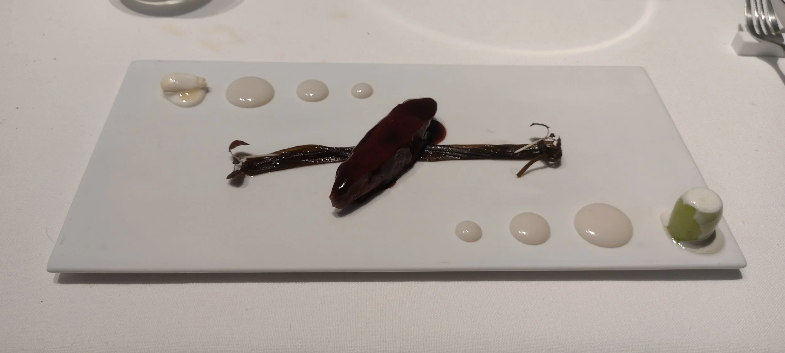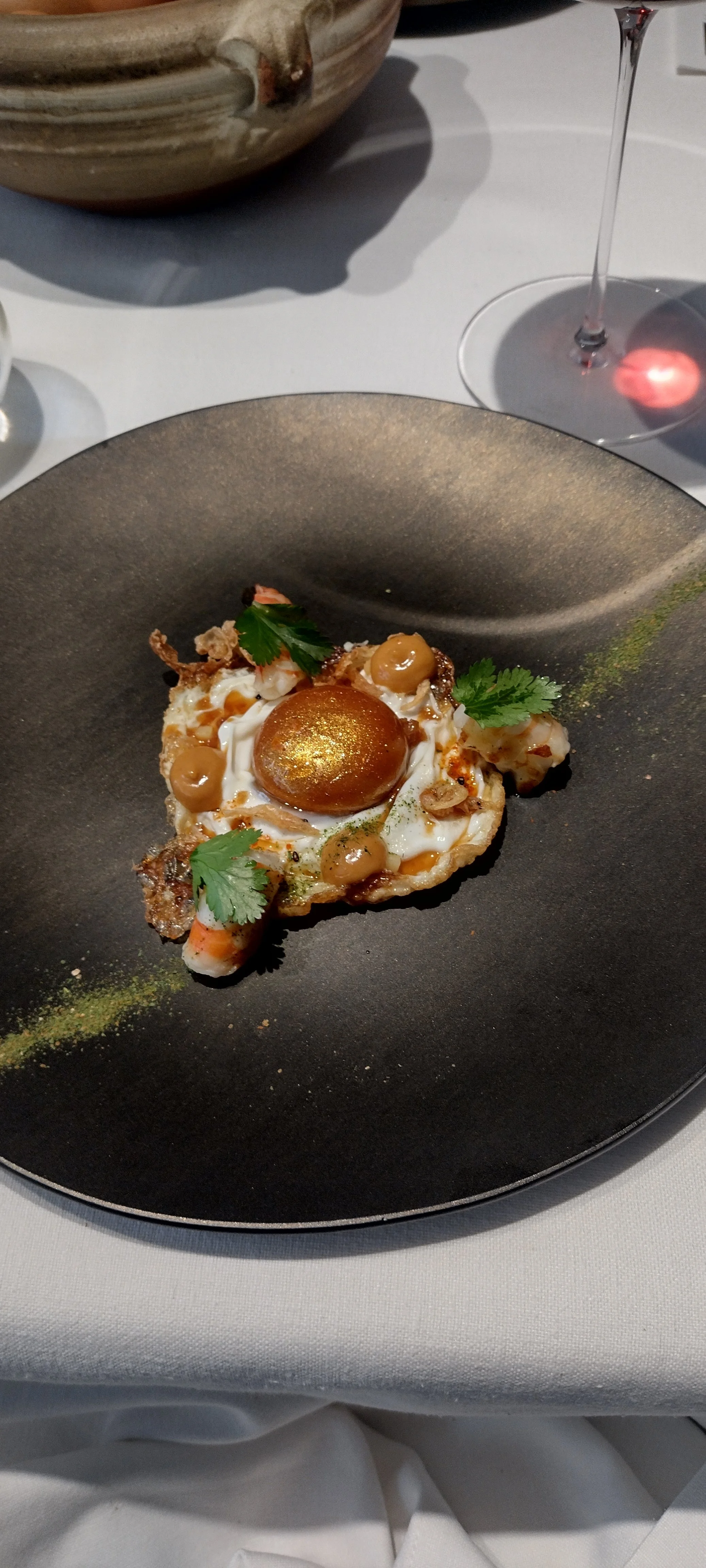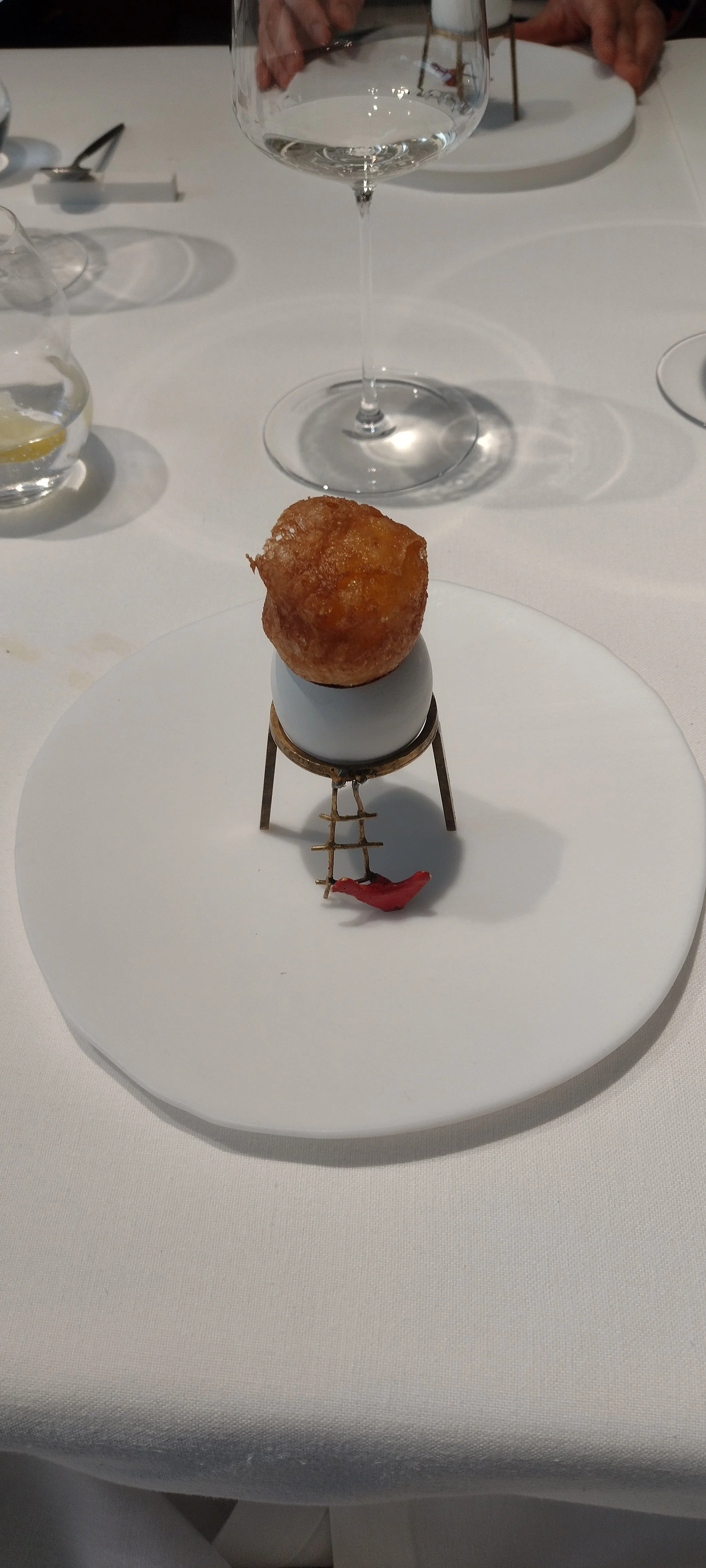 Es wird regional (katalanisch) mit Suquet de Peix, einem traditionellen, brühenhaltigen Eintopf der katalanischen Fischer. Dazu Kartoffelwolken und Safranaioli. Die Sauce wird als “Cappuccino” dargereicht. Ein wundervoll eleganter Fisch mit dezentem Knoblauch, auch das Kartoffelgebilde schmeckt fein und intensiv. Der Schluck aus der Cappuccino-Tasse liefert ergänzende Cremigkeit mit stimmiger Fischnote. Das ist ziemlich groß (9). Es folgt das legendäre "Goldene Ei". Hier soll der Gast die sonstigen Zutaten erraten. Ich tippe auf Kaisergranat/Langoustine, Knoblauch, Koriander, einen Fond aus Meeresfrüchten, Erdnuss, Zitrone und ein undefinierbares japanisches Gewürz, womit ich augenscheinlich ins Schwarze treffe. In Teilen ist das wieder zu kalt, aber wahrlich großartig im Geschmack und in der Komplexität (9). Es bleibt spielerisch: Zwei Kellner bringen Boxen, die wie der Versuch eines Nachwuchsmagiers aussehen, anhand eines etwas sperrigen Hilfsmittels selbst einen Zaubertrick zu schaffen. Und tatsächlich: Greift man das gut sichtbare Objekt darin, fasst man ins Leere. Eine Spiegelung, die eine optische Täuschung hervorruft. Tata: Das Objekt ist nämlich eigentlich im vorderen Teil der Box. Unabhängig von der Form der Präsentation handelt es sich um einen Cracker aus bzw. mit Mais und Foie Gras. Der Mais liefert eine wunderbare Süße und Knusprigkeit, die Foie Gras eine herrliche Cremigkeit und alles klingt harmonisch aus. Das ist mit das beste Maisgericht, das ich je hatte (8).