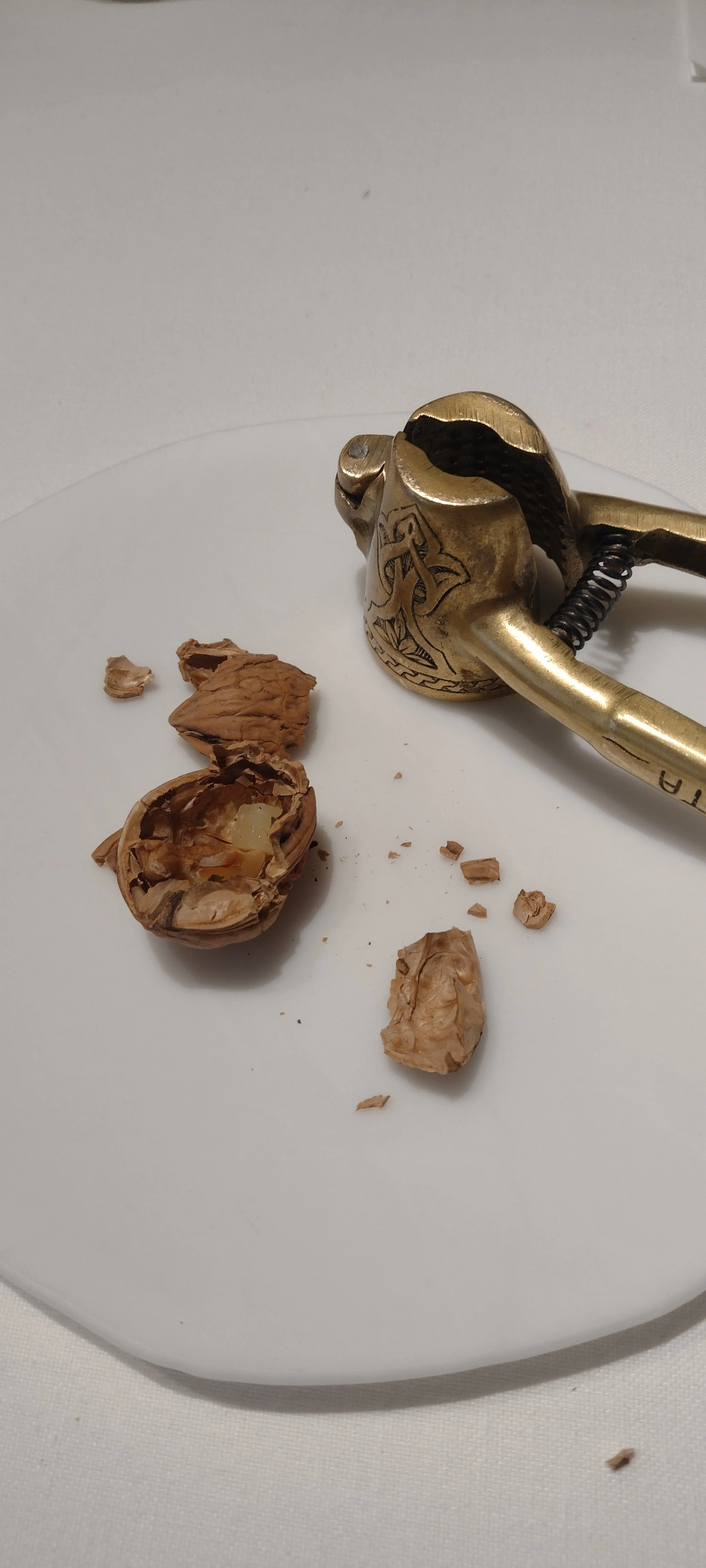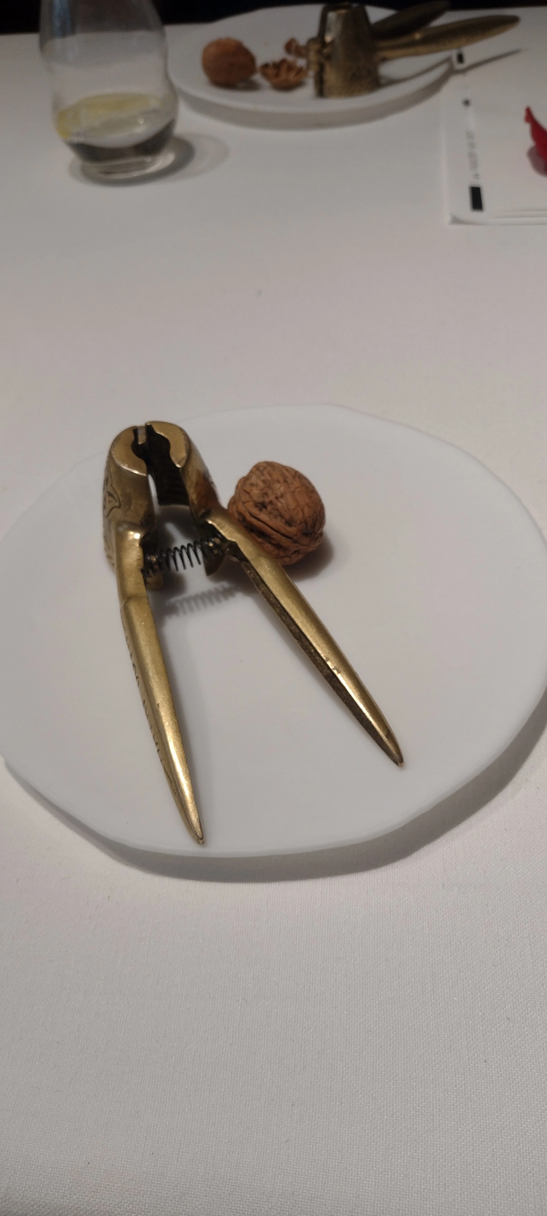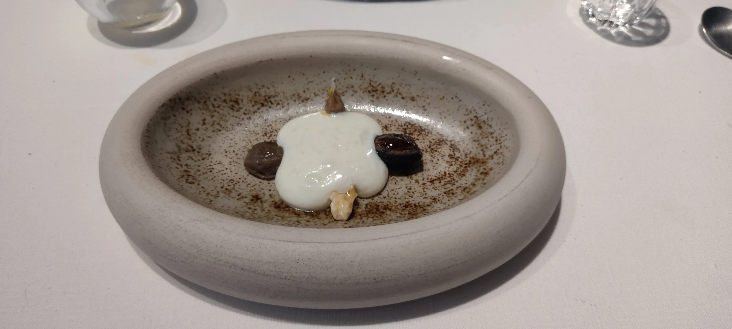 Ein hausgemachter Cider gibt ein kurzes Intermezzo (ohne Bewertung). Sogleich steht das Hauptgericht mit Taube an. Begleitet wird das Stück Fleisch von Meeresgemüse (falls es sowas gibt), Nüssen und Früchten, alles in asiatisch angehauchter, fermentierter Sauce. Das ist ein einwandfreies, zartes und saftiges Stück Taube mit für mich weniger passenden sides: Eines ist einfach eine Mandel, eines eine durchschnittliche grüne Traube (7,5). Und nun: das rätselhafteste Gericht des Tages: eine Walnuss mit Yuzu-Drink. In der Walnuss ist Käse eingebaut. Okay, handwerklich beeindruckend, aber trotzdem keine Ahnung, was das soll (6).