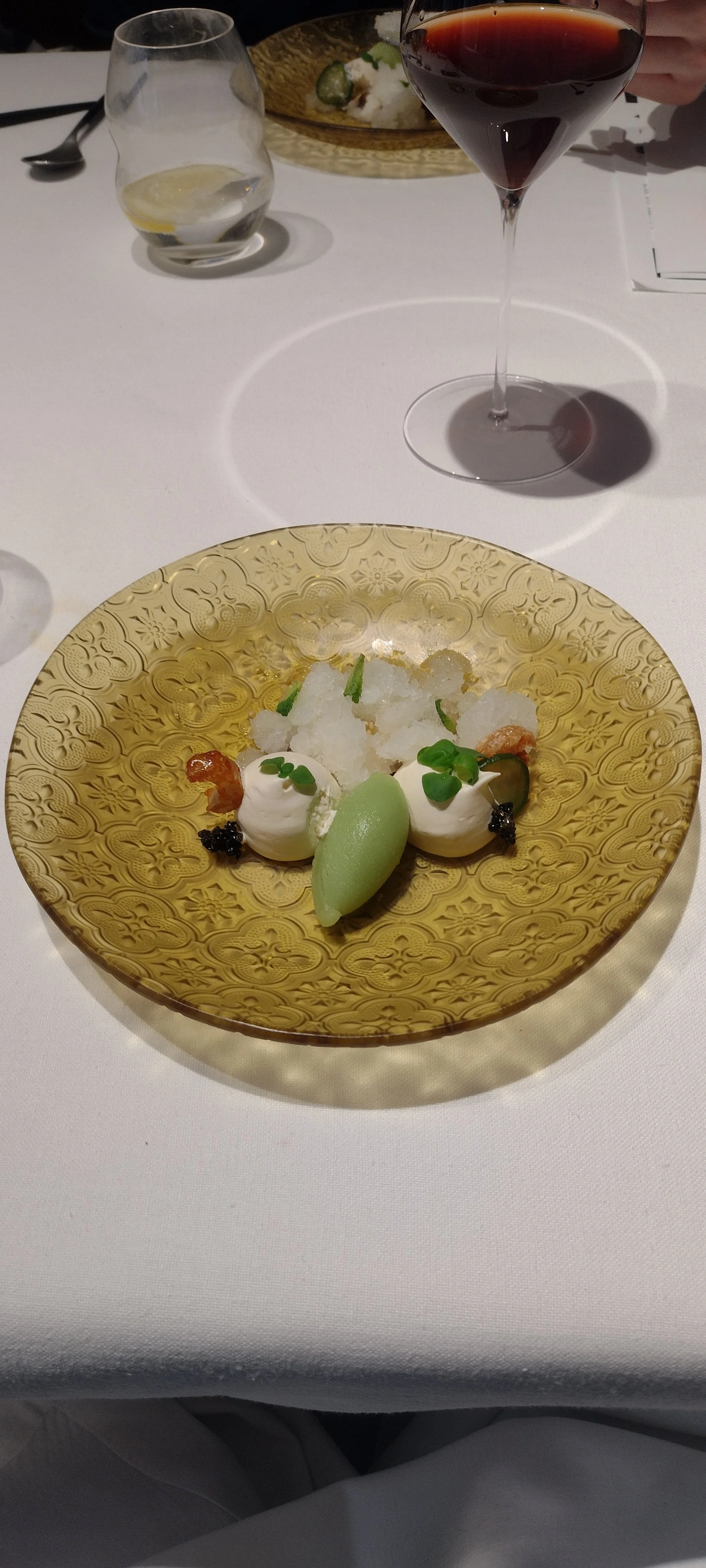Dann kommt ein eiskalter Trüffelwodka, der so schmeckt, wie man sich das vorstellt. Das heißt: klar - nussig - erdig; und: gut, wenn man sich darauf einlässt (7). Wir bleiben beim Motiv Trüffel mit einem entsprechenden Millefeuille. Das ist schwer zu essen, da anfällig für den schonungslosen Zerfall. Man schmeckt Teig und eher wenig Trüffel. Sternewürdig, klar, aber man hätte mehr draus machen können (7,5). Und jetzt steht ein potenzielles Highlight an. Die Ikone. Das lauwarme Saure-Sahne-Kaviar-Bällchen, von dem jede/r schwärmt, die/der hier schon mal war (und gewissermaßen meine ultimative Entscheidungshilfe für das Klassiker-Menü). Augen schließen und in zwei Bissen verspeist. Das ist teigiger als gedacht, könnte warm statt lauwarm sein, und ich finde, man hätte am Kaviar nicht so sparen müssen (auch wenn es das eleganter macht). In die Erinnerung prägt sich das Gericht nichtsdestotrotz ein (8). [Über die ganze Aufregung habe ich offensichtlich vergessen, das zu fotografieren.]