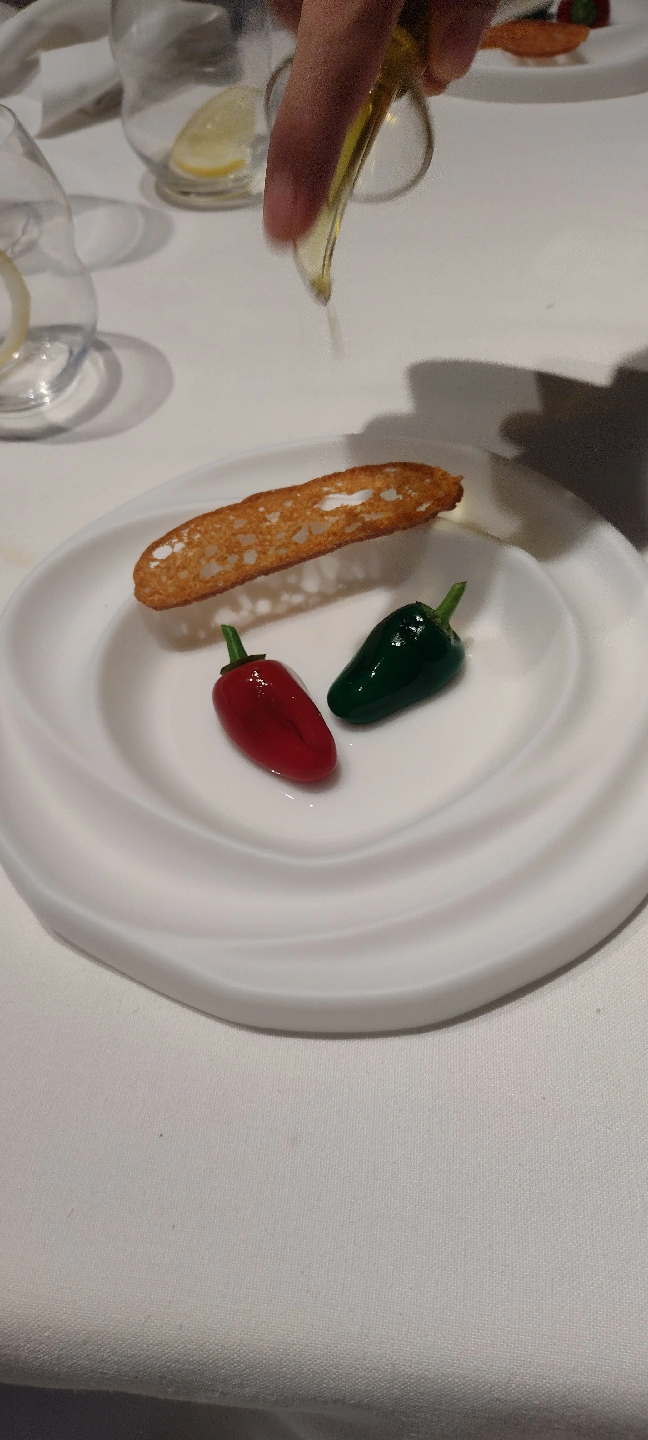 Ein Predessert wartet mit Karamell, Walnuss und Käse auf. Alles ist eher mittelprächtig, aber die Karamellpraline rundet am Ende schön ab (sofern man diese Essensabfolge beherzigt) (7). Das erste Dessert besteht aus Hoisin-Sauce, Gurke, Schweinefleisch, Honigmus und Ingwer. Ein erstaunlich erfrischendes Zusammenspiel, das durch den Schweinecracker und die chinesische Sauce mit Fett und Umami versehen wird. Die Gurke spielt durchgehend schön mit. Originell ist das, schmackhaft auch, aber nicht großartig (8). Als nächstes kommt schwarzer Sesam mit Joghurtcreme und wilden Erdbeeren. Eine sämig-vollmundige Gefälligkeitsbombe mit exotischer Sesamnote (8,5). Der vorletzte Gang vereint Chilischoten, Öl und Brot. Echte Chilis sind das jedoch nicht, vielmehr verkleiden sie die cremige Schokolade im Innern. Was das soll, ist völlig unklar. Weder ist es originell genug, um den Geschmack hintanzustellen. Noch passt das geschmacklich besonders gut zusammen. Eine Schokoladentafel von dieser Qualität wäre mir lieber gewesen (6,5).